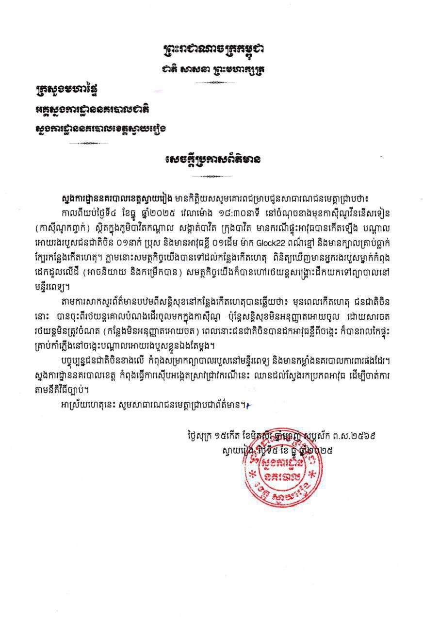 សេចក្តីប្រកាសព័ត៌មាន ពាក់ព័ន្ធទៅនឹងករណីផ្ទុះអាវុធ នៅក្រុងបាវិត កាលពីយប់មិញ សន្តិសុខសង្គម ដោយ TVFB ចេញផ្សាយ ថ្ងៃទី 5 ខែ ធ្នូ ឆ្នាំ 2025 សេចក្តីប្រកាសព័ត៌មាន ពាក់ព័ន្ធទៅនឹងករណីផ្ទុះអាវុធ នៅក្រុងបាវិត កាលពីយប់មិញ ចែករំលែក
