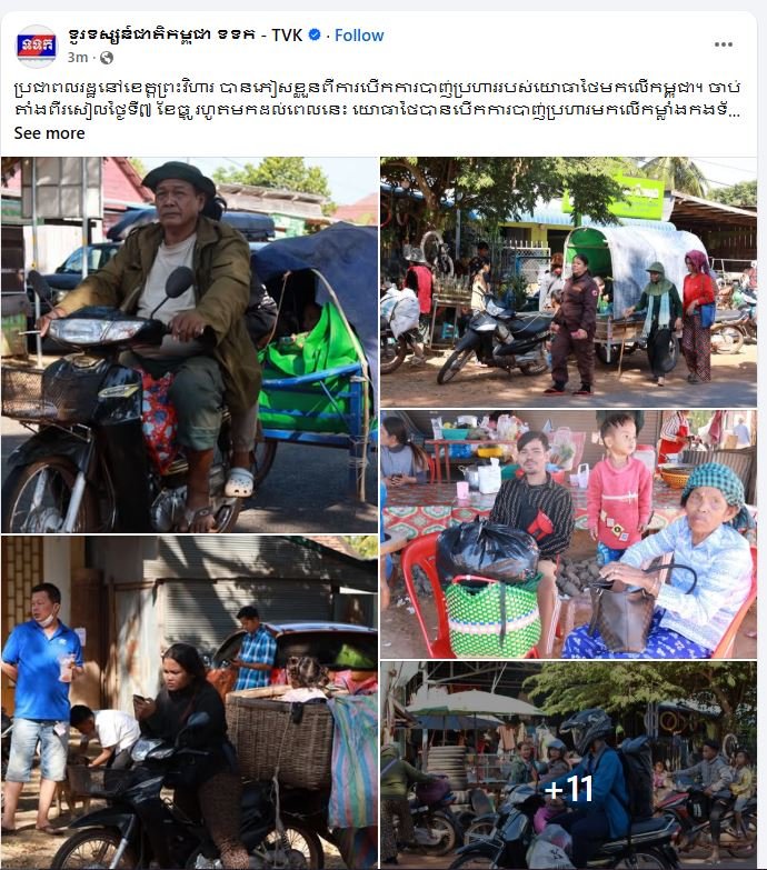 ខេត្តព្រះវិហារ ៖ យោងតាមផេកផ្លូវការរបស់ទូរទស្សន៍ជាតិកម្ពុជា បានឲ្យដឹងថា ប្រជាពលរដ្ឋនៅខេត្តព្រះវិហារ បានភៀសខ្លួនពីការបើកការបាញ់ប្រហាររបស់យោធាថៃមកលើកម្ពុជា។