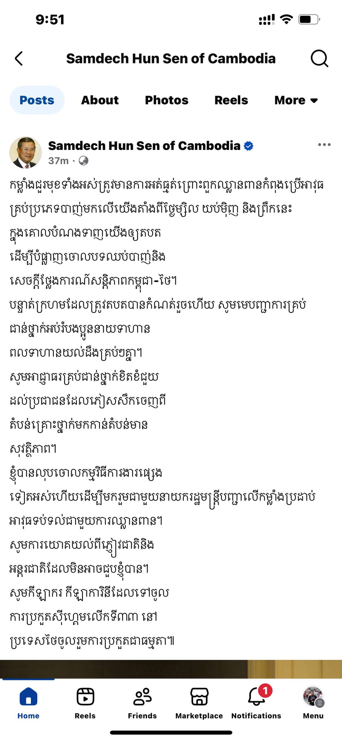 សម្តេចតេជោ ហ៊ុន សែន៖ បន្ទាត់ក្រហម ដែលត្រូវតបត បានកំណត់រួចហើយ សូមមេបញ្ជាការគ្រប់ជាន់ថ្នាក់អប់រំបងប្អូននាយទាហ៊ានពលទាហ៊ានយល់ដឹងគ្រប់ៗគ្នា, សូមអាជ្ញាធរគ្រប់ជាន់ថ្នាក់ខិតខំជួយដល់ប្រជាជនដែលភៀសសឹកចេញពីតំបន់គ្រោះថ្នាក់មកកាន់តំបន់មាន សុវត្តិភាព,ខ្ញុំបានលុបចោលកម្មវិធីការងារផ្សេងទៀតអស់ហើយដើម្បីមករួមជាមួយនាយករដ្ឋមន្ត្រីបញ្ជាលើកម្លាំងប្រដាប់អាវុធទប់ទល់ជាមួយការឈ្លានពាន