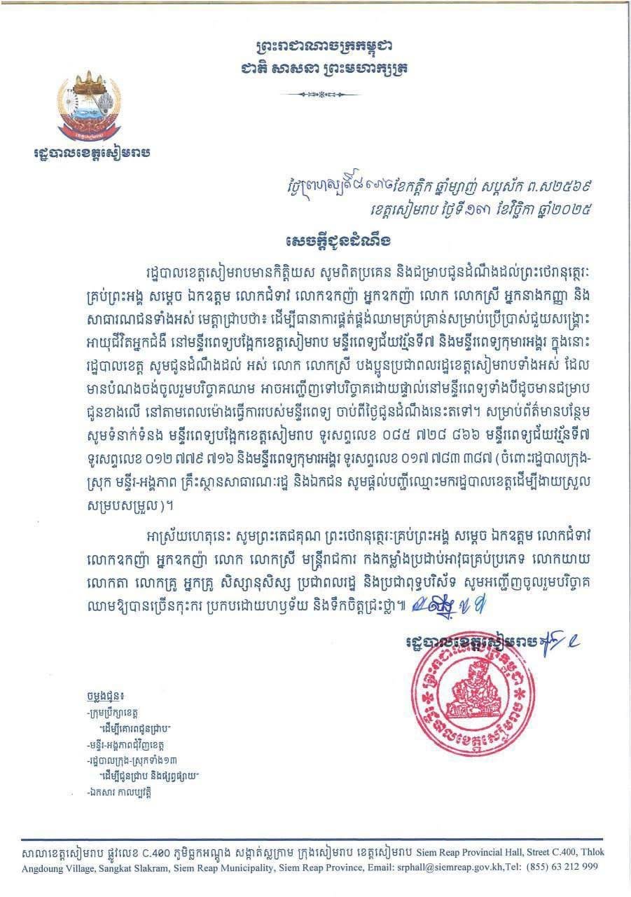 ខេត្តសៀមរាប ៖ រដ្ឋបាលខេត្តសៀមរាបមានកិត្តិយស សូមពិតប្រគេន និងជម្រាបជូនដំណឹងដល់ព្រះថេរានុត្ថេរៈ គ្រប់ព្រះអង្គ សម្តេច ឯកឧត្តម លោកជំទាវ លោកឧកញ៉ា អ្នកឧកញ៉ា លោក លោកស្រី អ្នកនាងកញ្ញា និង សាធារណជនទាំងអស់ មេត្តាជ្រាបថា៖ ដើម្បីធានាការផ្គត់ផ្គង់ឈាមគ្រប់គ្រាន់សម្រាប់ប្រើប្រាស់ជួយសង្គ្រោះ អាយុជីវិតអ្នកជំងឺ លោក លោកស្រី បងប្អូនប្រជាពលរដ្ឋខេត្តសៀមរាបទាំងអស់ ដែលមានបំណងចង់ចូលរួមបរិច្ចាគឈាម អាចអញ្ជើញទៅបរិច្ចាគដោយផ្ទាល់នៅមន្ទីរពេទ្យទាំងបីដូចខាងក្រោម :