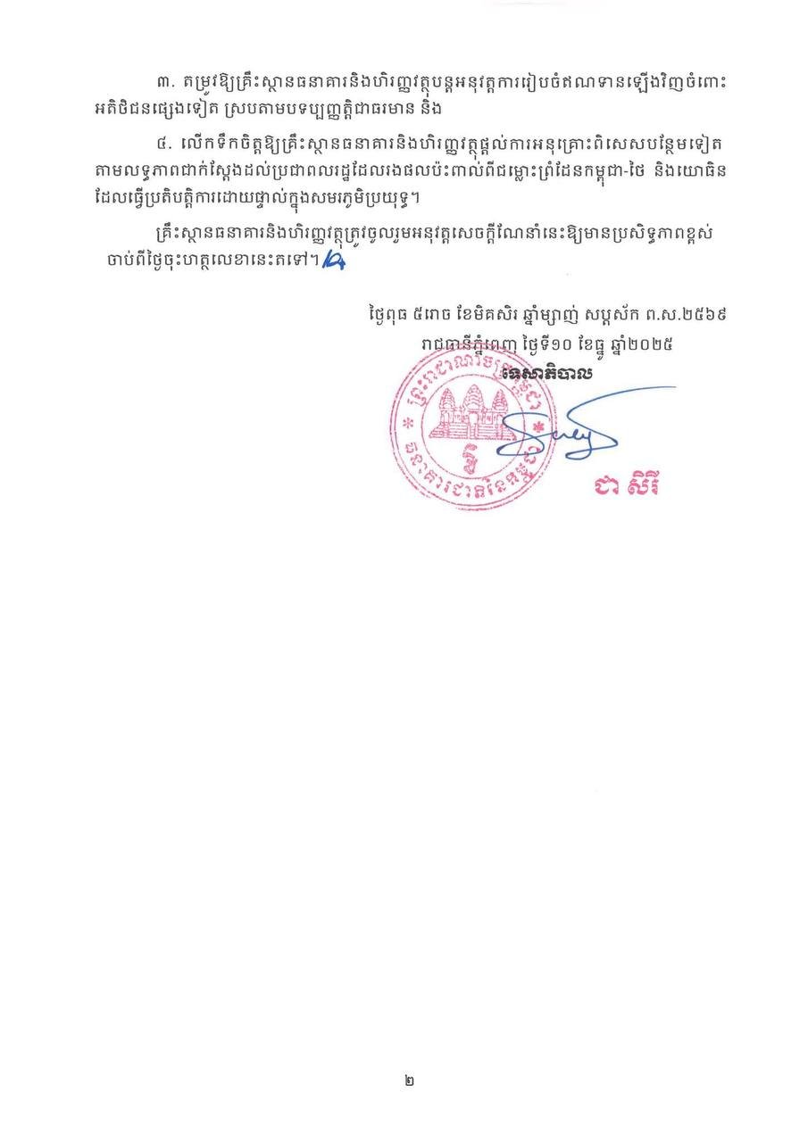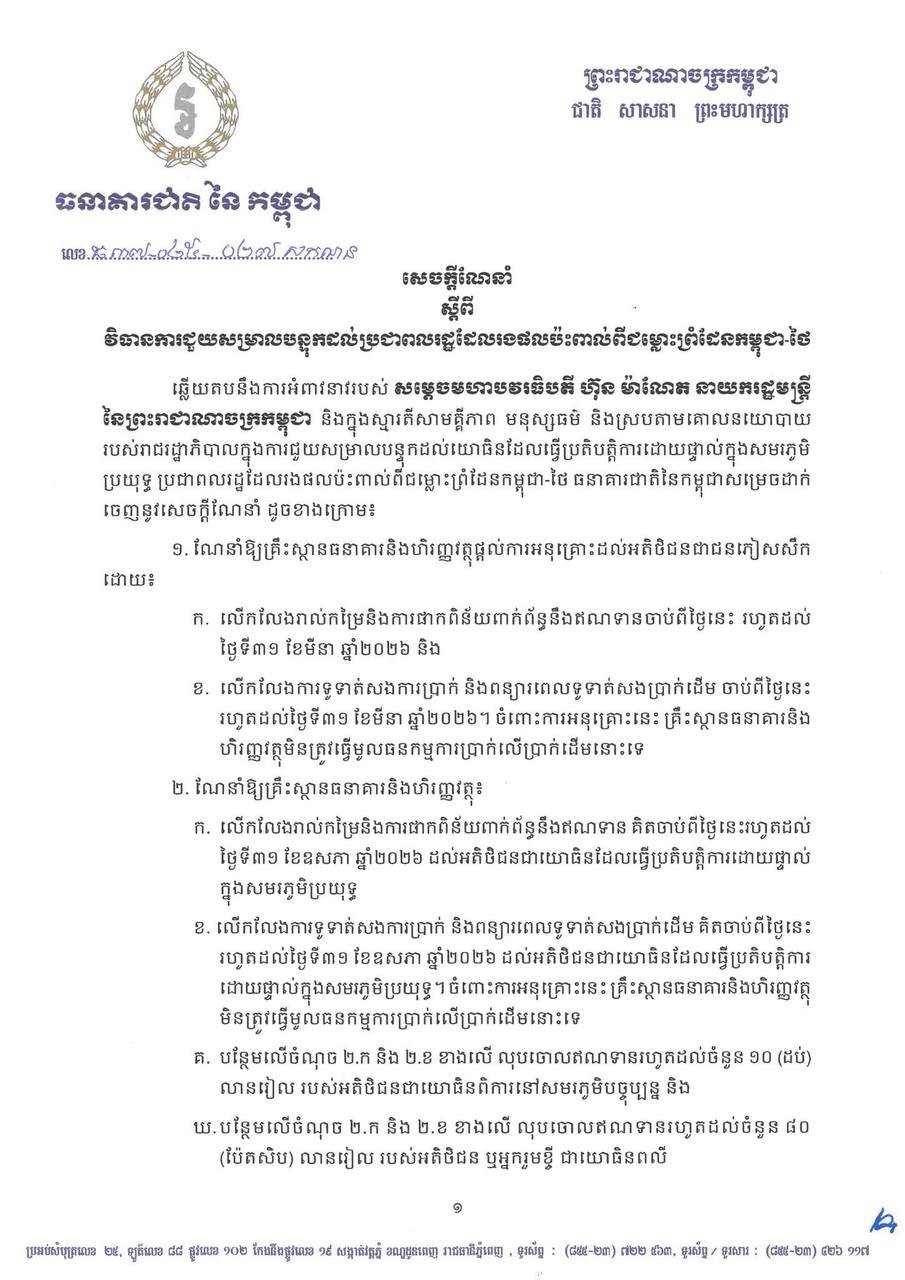 ធនាគារជាតិ នៃកម្ពុជា ចេញសេចក្ដីណែនាំជាថ្មី ស្តីអំពី វិធានការជួយសម្រាលបន្ទុកដល់ប្រជាពលរដ្ឋដែលរងផលប៉ះពាល់ពីជម្លោះព្រំដែនកម្ពុជា-ថៃ