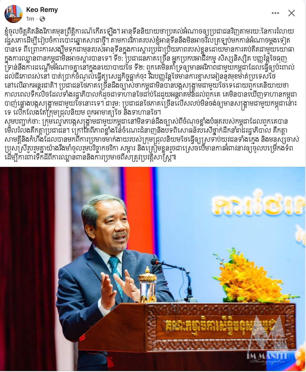 ទេសរដ្ឋមន្ត្រី កែវ រ៉េមី៖ អានុទីន នឹងមិនអាចវិលត្រឡប់មកកាន់អំណាចនៅថៃ ម្តងទៀតទេ ពីព្រោះការស្តារប្រជាប្រិយភាពរបស់ខ្លួនដោយគប់គិតជាមួយយោធាឈ្លានពានកម្ពុជា មិនអាចស្តារបានទេ
