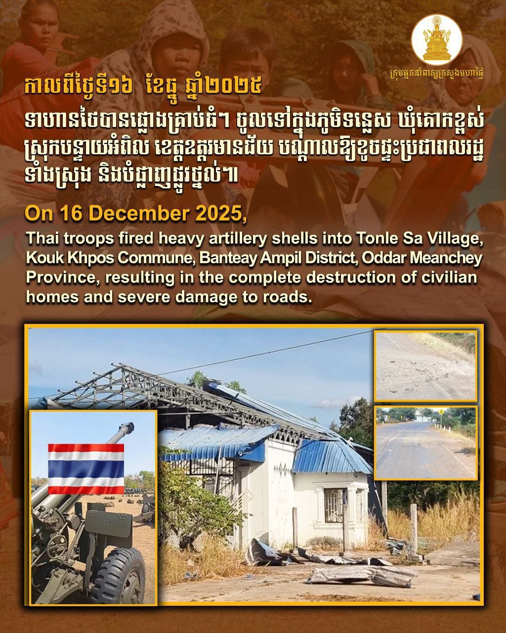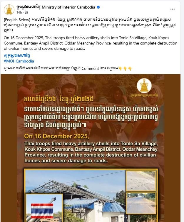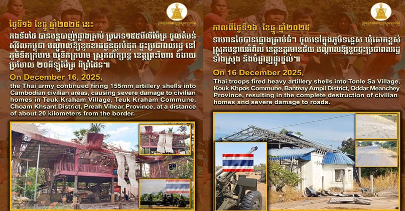 ក្រសួងមហាផ្ទៃបញ្ជាក់ថា កាលពីថ្ងៃទី១៦ ខែធ្នូ ឆ្នាំ២០២៥ ទាហានថៃបានផ្លោងគ្រាប់ធំៗ ចូលទៅក្នុងភូមិទន្លេ​ស​ ឃុំគោកខ្ពស់ ស្រុកបន្ទាយ​អំពិល​ ខេត្តឧត្ដរមានជ័យ​ បណ្ដាលឱ្យខូចផ្ទះប្រជាពលរដ្ឋទាំងស្រុង និងបំផ្លាញផ្លូវថ្នល់។