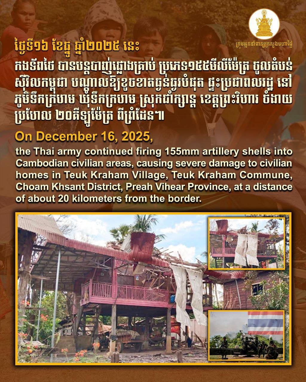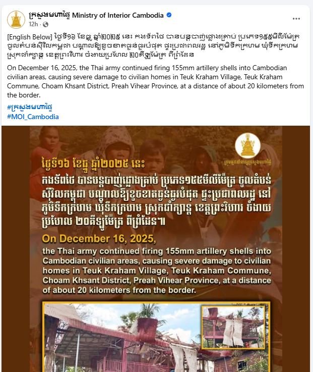ក្រសួងមហាផ្ទៃ បញ្ជាក់ទៀតថា នៅថ្ងៃទី១៦ ខែធ្នូ ឆ្នាំ២០២៥ ដដែល កងទ័ពថៃ បានបន្តបាញ់ផ្លោងគ្រាប់ ប្រភេទ១៥៥មីលីម៉ែត្រ ចូលតំបន់ស៊ីវិលកម្ពុជា បណ្ដាលឱ្យខូចខាតធ្ងន់ធ្ងរបំផុត ផ្ទះប្រជាពលរដ្ឋ នៅភូមិទឹកក្រហម​ ឃុំទឹកក្រហម​ ស្រុកជាំក្សាន្ត ខេត្តព្រះវិហារ ចំងាយប្រហែល ២០គីឡូម៉ែត្រ ពីព្រំដែន ៕