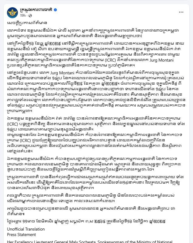 លោកជំទាវ ឧត្តមសេនីយ៍ឯក ម៉ាលី សុជាតា អ្នកនាំពាក្យក្រសួងការពារជាតិ នៃព្រះរាជាណាចក្រកម្ពុជា សូមជម្រាបជូនសាធារណជន អ្នកសារព័ត៌មានជាតិ និងអន្តរជាតិមេត្តាជ្រាបថា៖