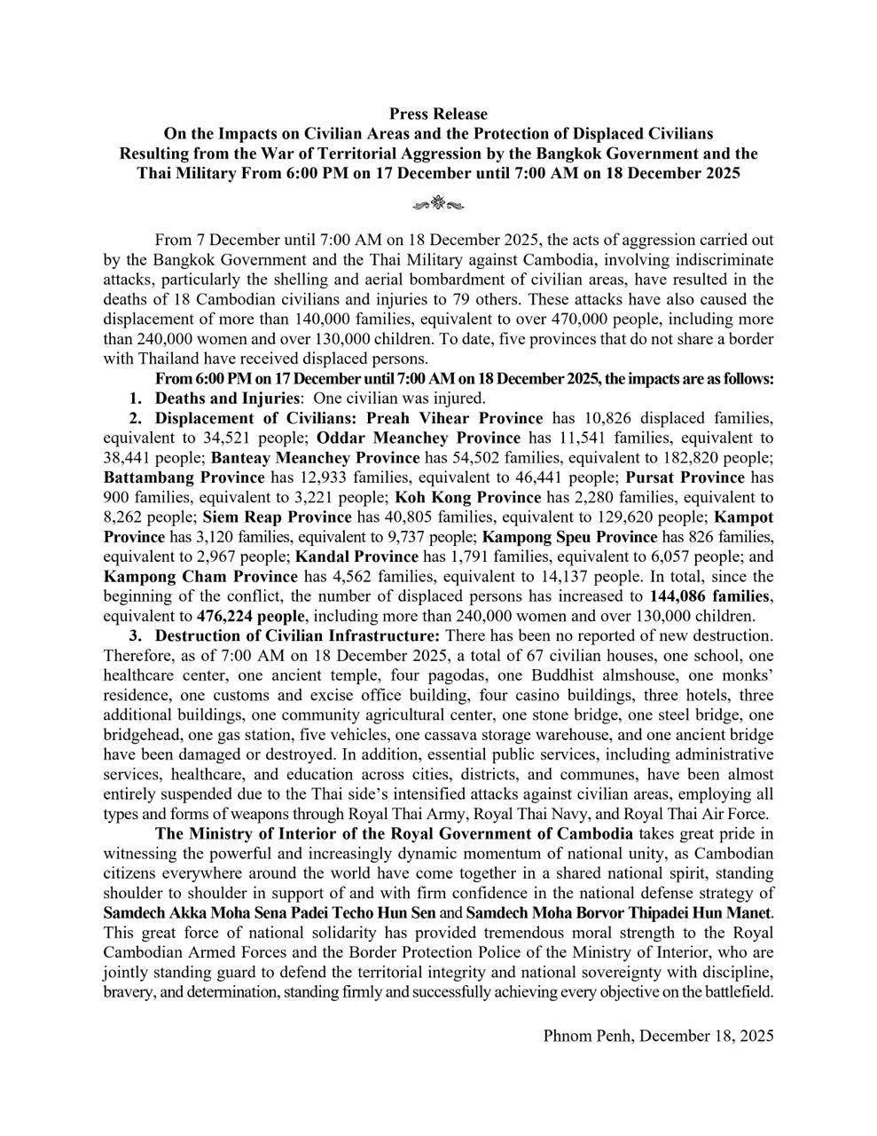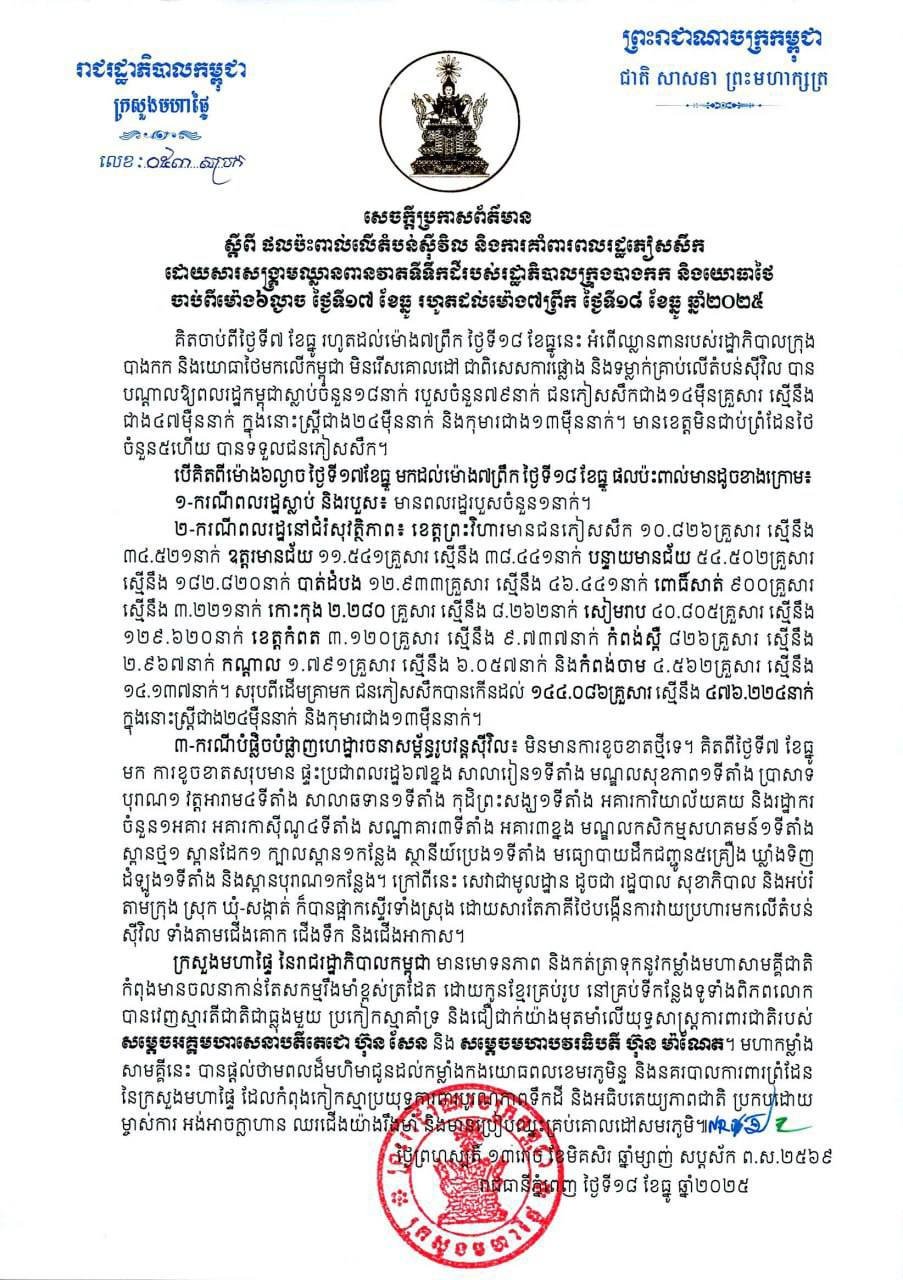 ក្រសួងមហាផ្ទៃ នៃរាជរដ្ឋាភិបាលកម្ពុជា ចេញសេចក្ដីប្រកាសព័ត៌មានស្ដីពី ផលប៉ះពាល់លើតំបន់ស៊ីវិល និងការគាំពារពលរដ្ឋភៀសសឹក ដោយសារសង្គ្រាមឈ្លានពានវាតទីទឹកដីរបស់រដ្ឋាភិបាលក្រុងបាងកក និងយោធាថៃ ចាប់ពីម៉ោង៦ល្ងាច ថ្ងៃទី១៧ ខែធ្នូ រហូតដល់ម៉ោង៧ព្រឹក ថ្ងៃទី១៨ ខែធ្នូ ឆ្នាំ២០២៥