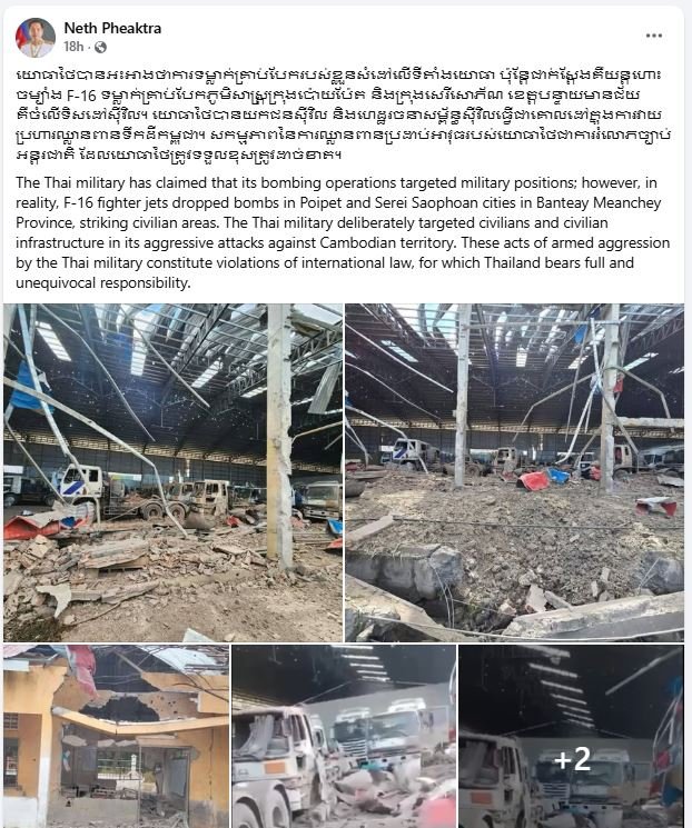 ខេត្តបន្ទាយមានជ័យ ៖ យោងតាមការបង្ហោះនៅលើផេកផ្លូវការរបស់ ឯកឧត្តម នេត ភក្ត្រា រដ្ឋមន្ត្រីក្រសួងព័ត៌មាន នៅថ្ងៃទី១៩ ខែធ្នូ ឆ្នាំ២០២៥ បានលើកឡើងថា យោធាថៃបានអះអាងថាការទម្លាក់គ្រាប់បែករបស់ខ្លួនសំដៅលើទីតាំងយោធា ប៉ុន្តែជាក់ស្តែងគឺយន្តហោះចម្បាំង F-16 ទម្លាក់គ្រាប់បែកភូមិសាស្ត្រក្រុងប៉ោយប៉ែត និងក្រុងសេរីសោភ័ណ ខេត្តបន្ទាយមានជ័យ គឺចំលើទិសដៅស៊ីវិល។ យោធាថៃបានយកជនស៊ីវិល និងហេដ្ឋរចនាសម្ព័ន្ធស៊ីវិលធ្វើជាគោលដៅក្នុងការវាយប្រហារឈ្លានពានទឹកដីកម្ពុជា។