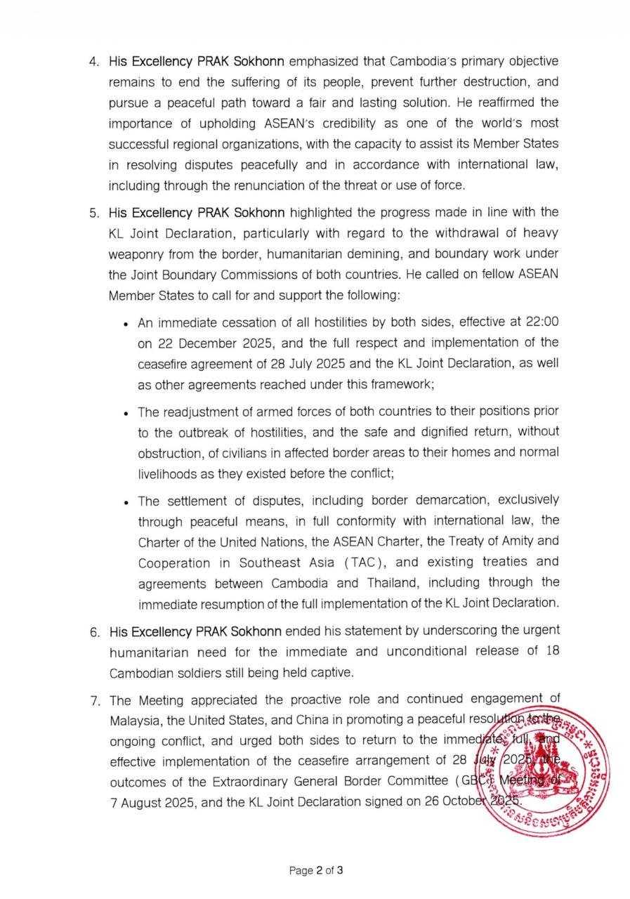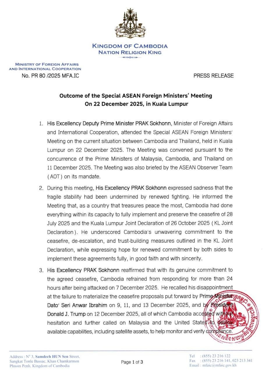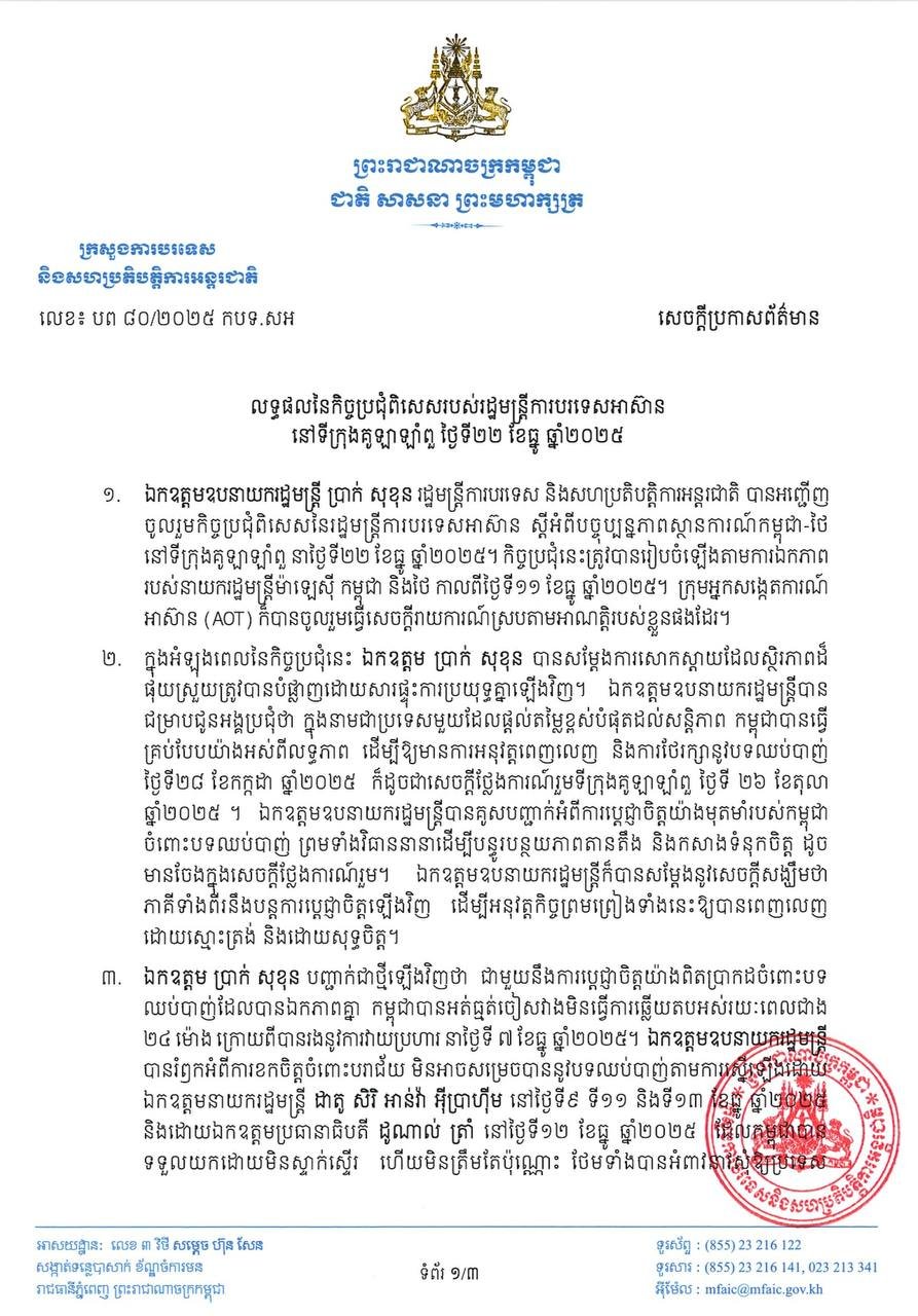 ក្រសួងការបរទេស ប្រកាសអំពីលទ្ធផល នៃកិច្ចប្រជុំពិសេសរបស់រដ្ឋមន្ត្រីការបរទេសអាស៊ាន នៅទីក្រុងគូឡាឡាំពួ ថ្ងៃទី២២ ខែធ្នូ ឆ្នាំ២០២៥
