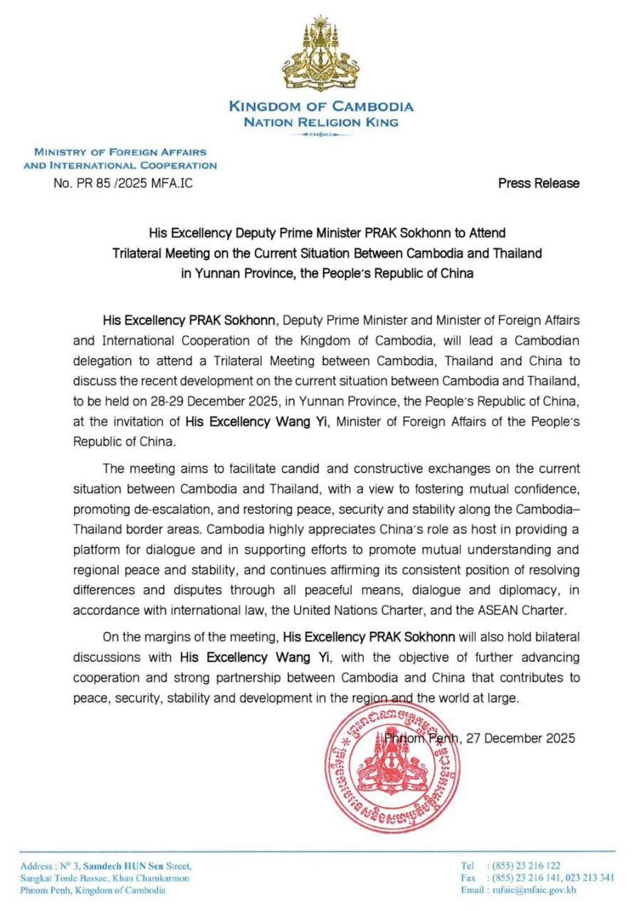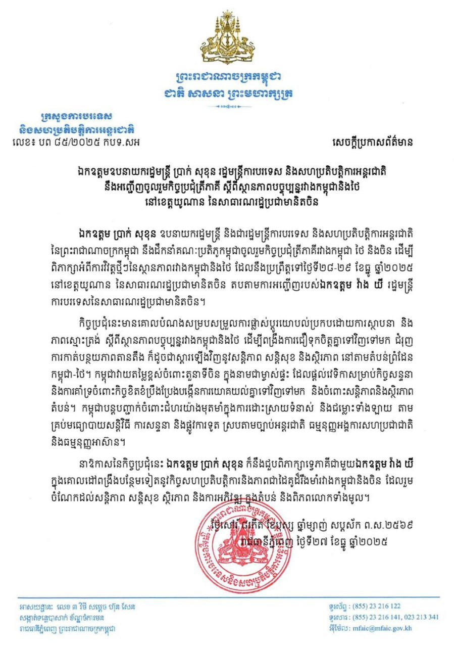 បន្ទាប់ពីកិច្ចប្រជុំនៅថ្ងៃនេះរួច! ឯកឧត្តមឧបនាយករដ្ឋមន្ត្រី ប្រាក់ សុខុន នឹងអញ្ជើញចូលរួមកិច្ចប្រជុំត្រីភាគី ពីស្ថានភាពបច្ចុប្បន្នរវាងកម្ពុជា-ថៃ នៅចិននៅថ្ងៃទី២៨ -២៩ខែធ្នូ