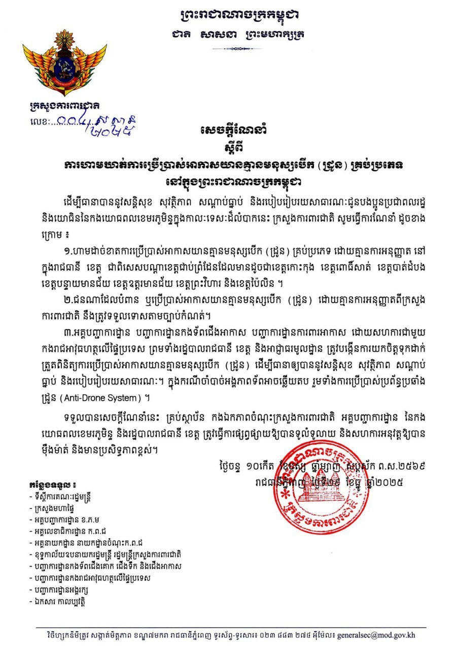 ក្រសួងការពារជាតិ ហាមឃាត់ដាច់ខាតការបង្ហោះ(ដ្រូន) គ្រប់ប្រភេទនៅទូទាំងប្រទេស ជាពិសេសតាមបណ្តាខេត្តជាប់ព្រំដែន ព័ត៌មានជាតិ ដោយ TVFB ចេញផ្សាយ ថ្ងៃទី 30 ខែ ធ្នូ ឆ្នាំ 2025 ក្រសួងការពារជាតិ ហាមឃាត់ដាច់ខាតការបង្ហោះ(ដ្រូន) គ្រប់ប្រភេទនៅទូទាំងប្រទេស ជាពិសេសតាមបណ្តាខេត្តជាប់ព្រំដែន ចែករំលែក