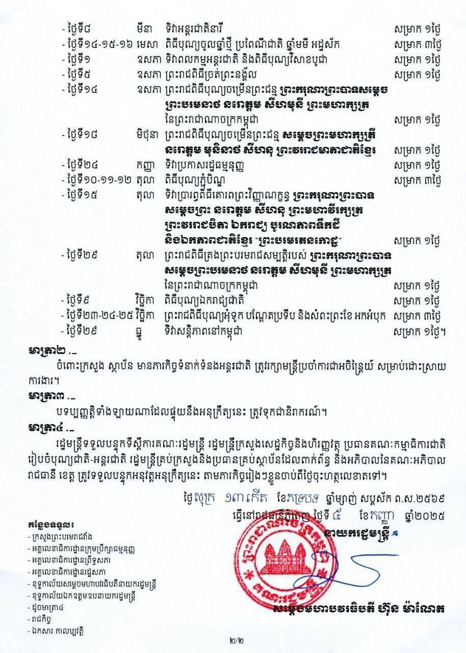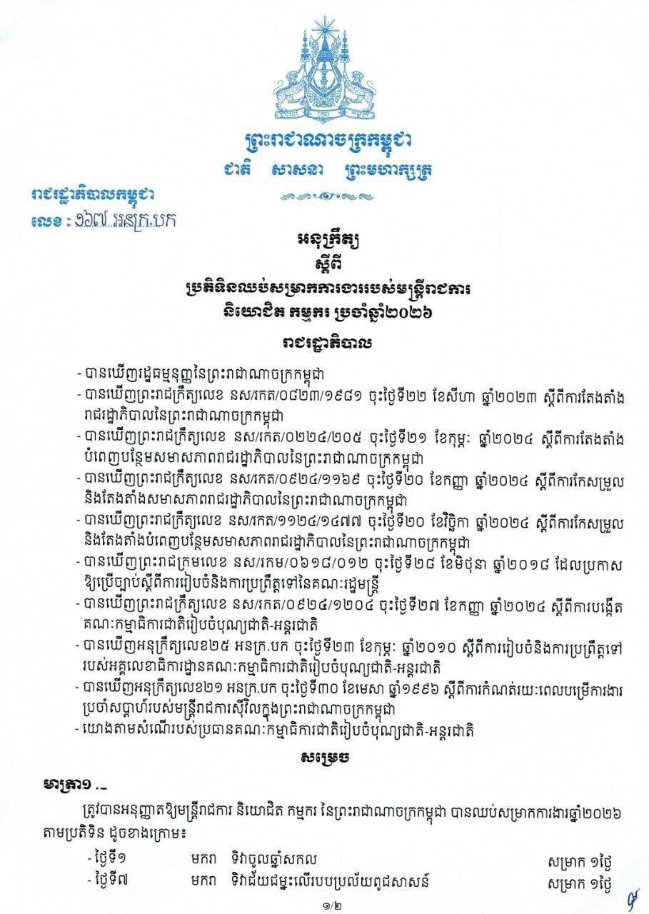 ប្រតិទិនឈប់សម្រាកការងាររបស់មន្ត្រីរាជការ និយោជិត កម្មករ ប្រចាំឆ្នាំ២០២៦ ព័ត៌មានជាតិ ដោយ TVFB ចេញផ្សាយ ថ្ងៃទី 31 ខែ ធ្នូ ឆ្នាំ 2025 ប្រតិទិនឈប់សម្រាកការងាររបស់មន្ត្រីរាជការ និយោជិត កម្មករ ប្រចាំឆ្នាំ២០២៦ ចែករំលែក