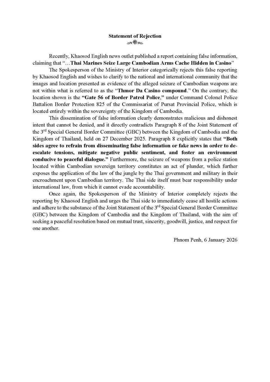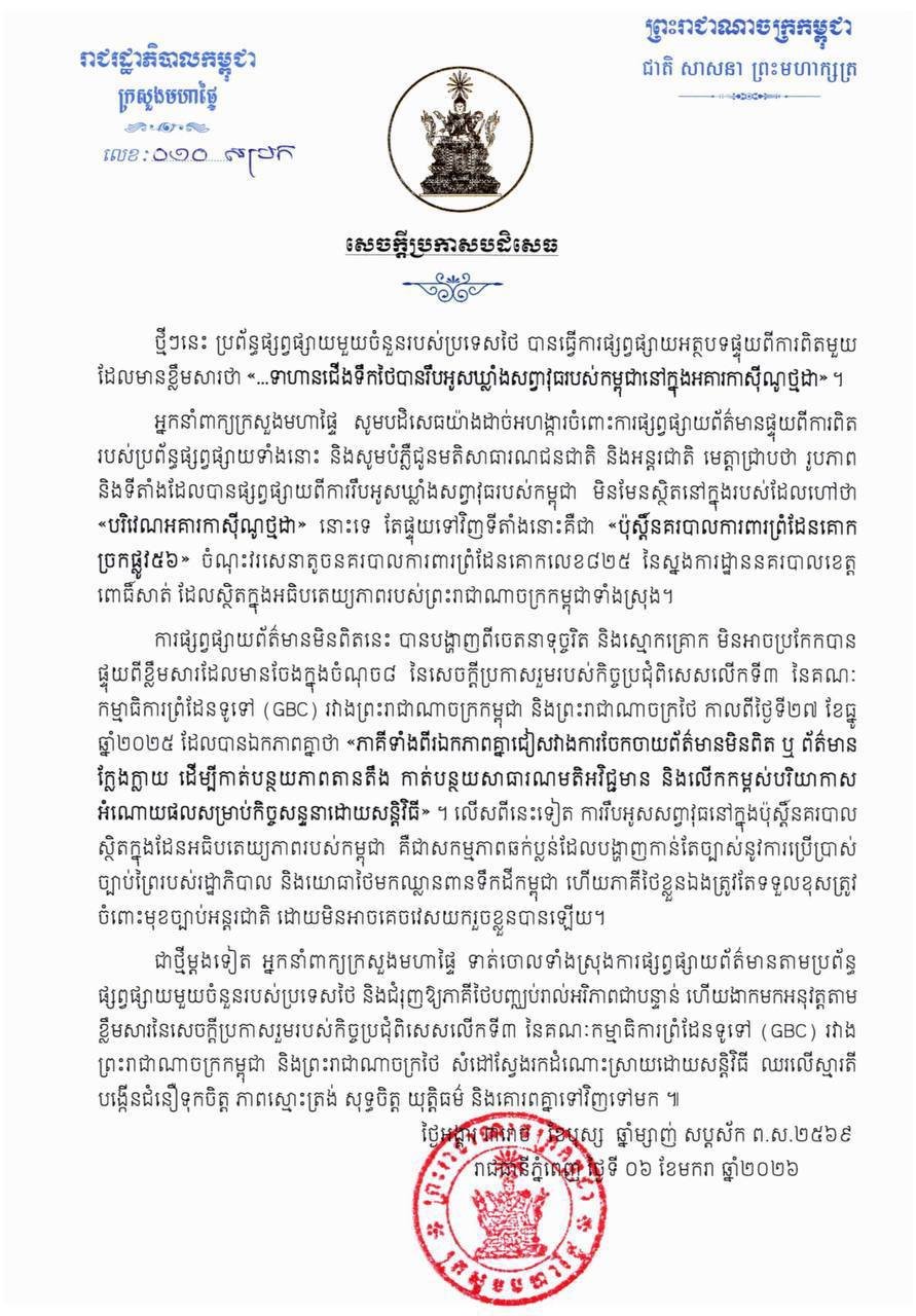 ក្រសួងមហាផ្ទៃ ចេញសេចក្ដីប្រកាសបដិសេធ ការផ្សាយរបស់កាសែត Khaosod English ថា “ទាហានជើងទឹកថៃរឹបអូសឃ្លាំងសព្វាវុធកម្ពុជាក្នុងអគារកាស៊ីណូថ្មដា” ខណៈការពិត គឺជា “ប៉ុស្តិ៍នគរបាលការពារព្រំដែនគោក” ក្នុងដែនអធិបតេយ្យកម្ពុជា