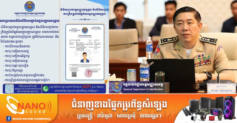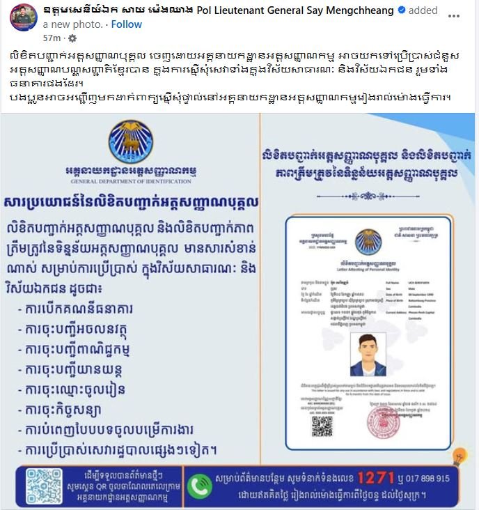 ឧត្តមសេនីយ៍ឯក សាយ ម៉េងឈាង៖ លិខិតបញ្ជាក់អត្តសញ្ញាណបុគ្គល ចេញដោយអគ្គនាយកដ្ឋានអត្តសញ្ញាណកម្ម អាចយកទៅប្រើប្រាស់ជំនួសអត្តសញ្ញាណបណ្ណសញ្ជាតិខ្មែរបាន ក្នុងការស្នើសុំសេវាទាំងក្នុងវិស័យសាធារណៈ និងវិស័យឯកជន រួមទាំងធនាគារផងដែរ បងប្អូនអាចអញ្ជើញមកដាក៉ពាក្យស្នើសុំផ្ទាល់នៅអគ្គនាយកដ្ឋានអត្តសញ្ញាណកម្មរៀងរាល់ម៉ោងធ្វើការ