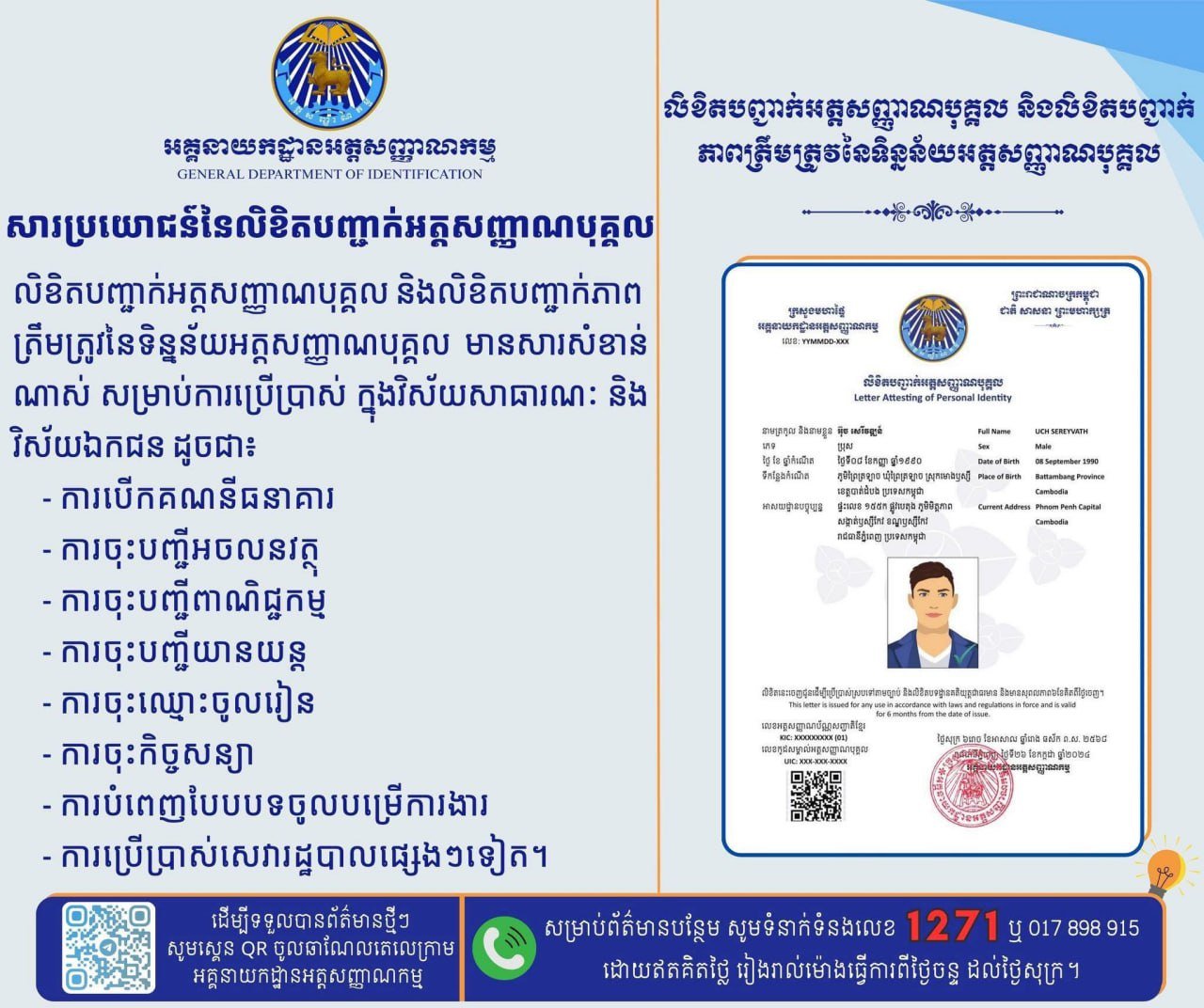 យោងតាមការបង្ហោះរបស់លោកឧត្តមសេនីយ៍ឯក សាយ ម៉េងឈាង អគ្គនាយករង នៃអគ្គនាយកដ្ឋានអត្តសញ្ញាណកម្ម បង្ហោះនៅព្រឹកថ្ងៃទី៨ ខែមករា ឆ្នាំ២០២៦នេះទាំងស្រុងថា លិខិតបញ្ជាក់អត្តសញ្ញាណបុគ្គល ចេញដោយអគ្គនាយកដ្ឋានអត្តសញ្ញាណកម្ម អាចយកទៅប្រើប្រាស់ជំនួសអត្តសញ្ញាណបណ្ណសញ្ជាតិខ្មែរបាន ក្នុងការស្នើសុំសេវាទាំងក្នុងវិស័យសាធារណៈ និងវិស័យឯកជន រួមទាំងធនាគារផងដែរ។