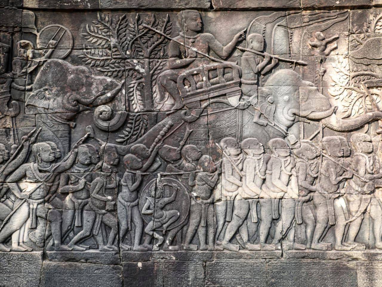 ចម្លាក់ទាំងនោះបានរៀបរាប់ពីជីវភាពរស់នៅរបស់ប្រជាជន ពិធីសាសនា ក្បួនទ័ពចេញច្បាំង ចម្បាំងជើងទឹក និងចម្បាំងជើងគោករវាងទ័ពខ្មែរ និងទ័ពចាម ព្រមទាំងបង្ហាញពីទិដ្ឋភាពផ្សារលក់ដូរ និងការសាងសង់ប្រាសាទ។ល៕