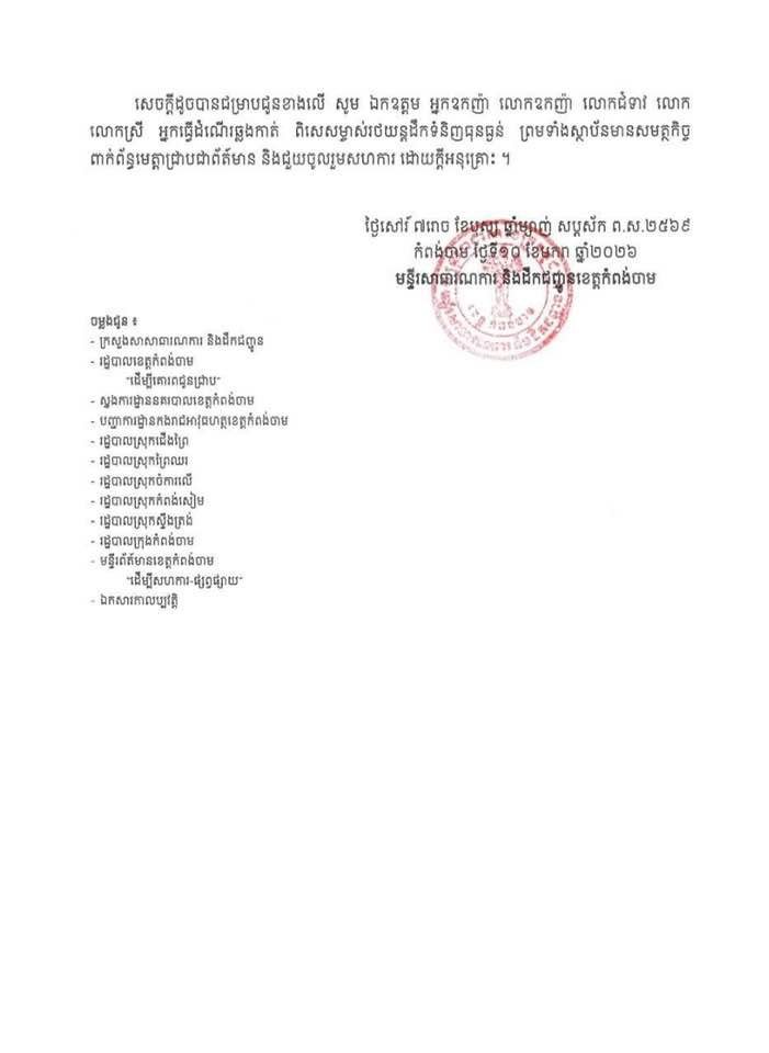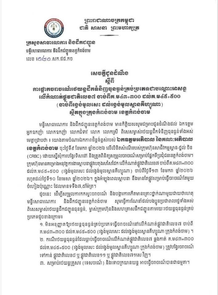 សេចក្តីជូនដំណឹង ស្តីពី ការផ្អាកចរាចរណ៍រថយន្តដឹកទំនិញធុនធ្ងន់គ្រប់ប្រភេទជាបណ្តោះអាសន្ន លើកំណាត់ផ្លូវជាតិលេខ៧ ចាប់ពីគ.ម៤៣+៣០០ ដល់គ.ម៤៥+៥០០ (ចាប់ពីរង្វង់មូលសេះ ដល់រង្វង់មូលស្ពានគីហ្សូណា) ស្ថិតក្នុងក្រុងកំពង់ចាម ខេត្តកំពង់ចាម