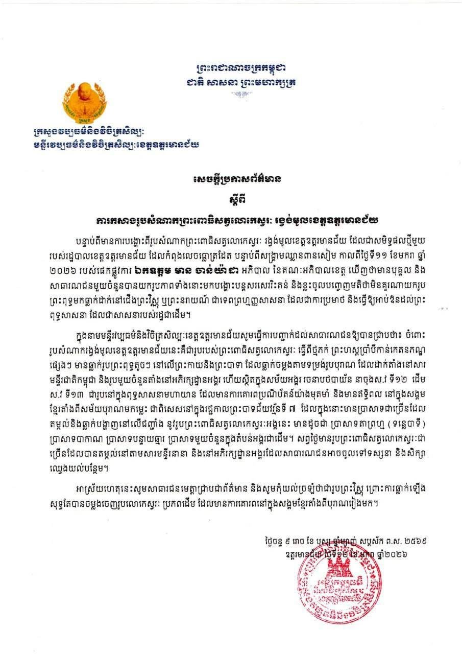 មន្ទីរវប្បធម៌ និងវិចិត្រសិល្បៈខេត្តឧត្តរមានជ័យ ចេញសេចក្តីប្រកាសព័ត៌មាន ស្តីពីការកសាងរូបសំណាកព្រះពោធិសត្វលោកេស្វរៈ រង្វង់មូលខេត្តឧត្តរមានជ័យ