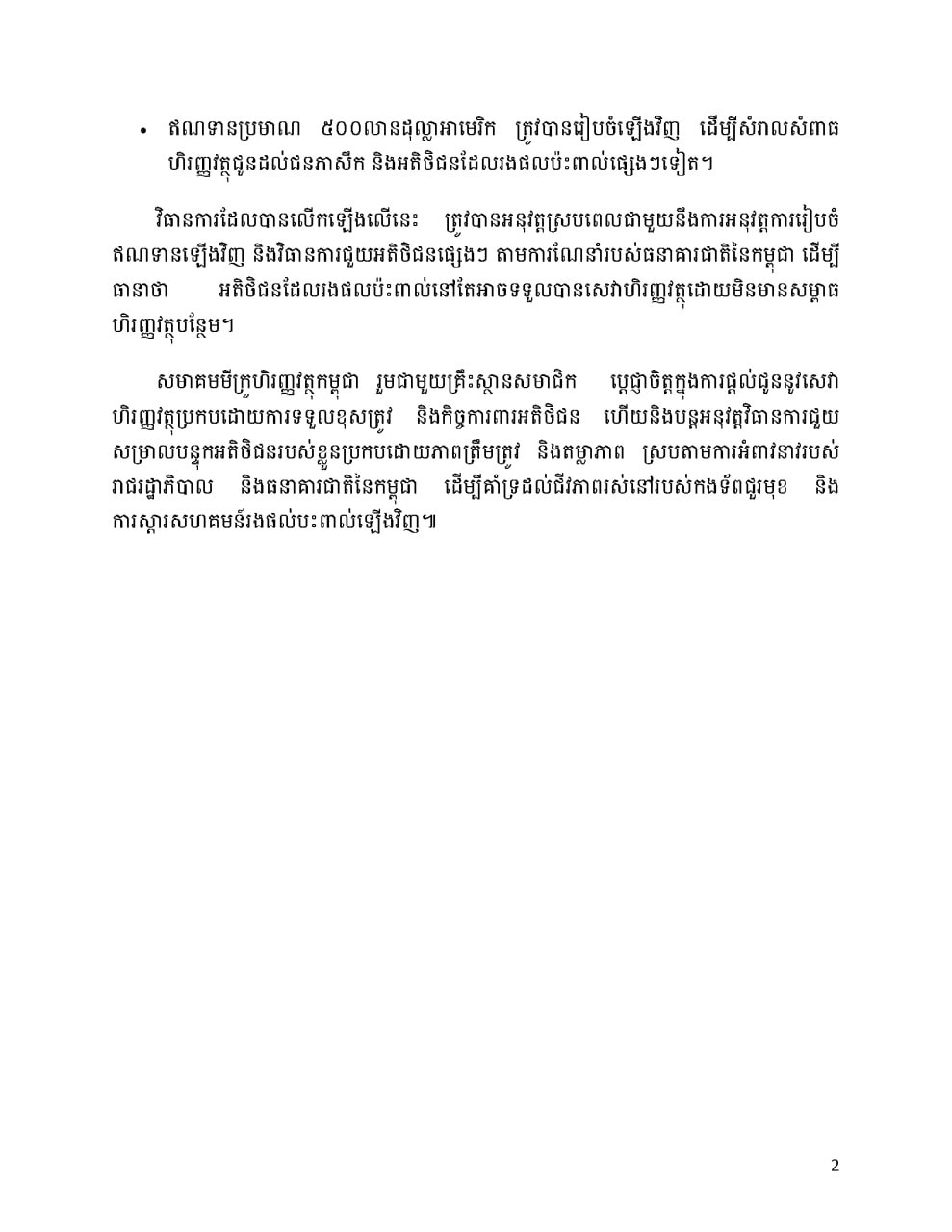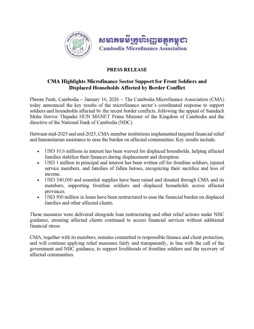 សមាគមមីក្រូហិរញ្ញវត្ថុកម្ពុជា លើកលែងការប្រាក់សរុប ១០,៦លានដុល្លារអាមេរិកសម្រាប់គ្រួសារជនភៀសសឹក និងលុបចោលបំណុល ទាំងដើមទាំងការប្រាក់ ប្រមាណ ១លានដុល្លារសម្រាប់យោធិនជួរមុខ យោធិនរបួស និងគ្រួសាររបស់យោធិនពលី ដើម្បីជាការដឹងគុណ ចំពោះការលះបង់ និងការបាត់បង់ចំណូលរបស់ពួកគាត់|