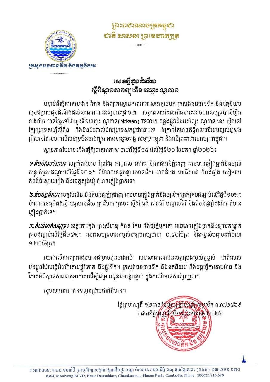 ក្រសួងធនធានទឹកជូនដំណឹង! កម្ពុជានឹងរងឥទ្ធិពលព្យុះ ណូកាន (Nokaen) បណ្តាលឱ្យខេត្តមួយចំនួនមានភ្លៀង និងខ្យល់កន្ត្រាក់កម្ពុជានឹងរងឥទ្ធិពលព្យុះ ណូកាន (Nokaen) បណ្តាលឱ្យខេត្តមួយចំនួនមានភ្លៀង និងខ្យល់កន្ត្រាក់