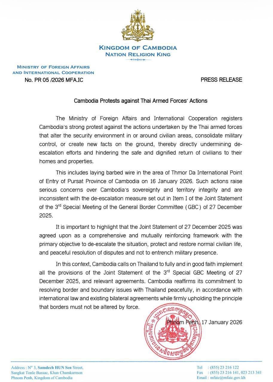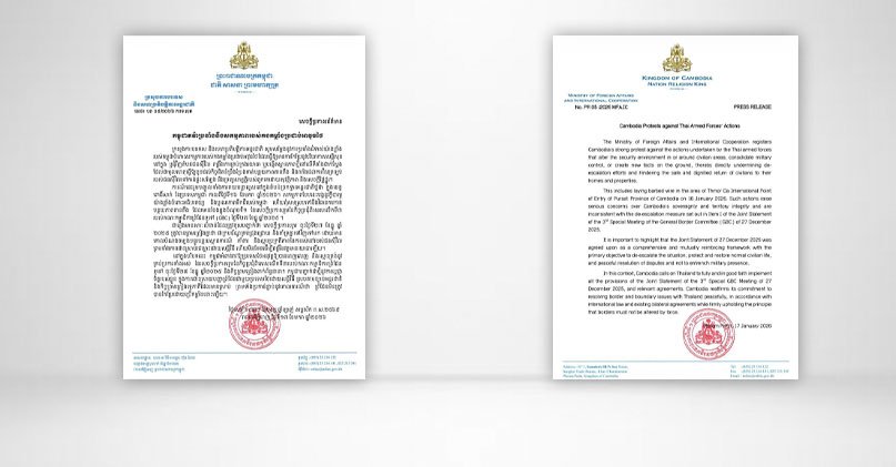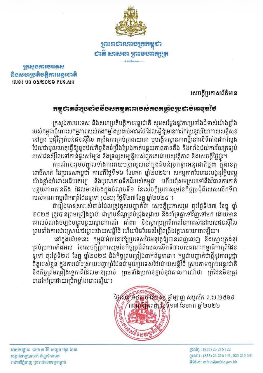 ក្រសួងការបរទេស និងសហប្រតិបត្តិការអន្តរជាតិ ចេញប្រកាសព័ត៌មានតវ៉ាប្រឆាំងនឹងសកម្មភាពរបស់កងកម្លាំងប្រដាប់អាវុធថៃ ព័ត៌មានជាតិ ដោយ TVFB ចេញផ្សាយ ថ្ងៃទី 19 ខែ មករា ឆ្នាំ 2026 ក្រសួងការបរទេស និងសហប្រតិបត្តិការអន្តរជាតិ ចេញប្រកាសព័ត៌មានតវ៉ាប្រឆាំងនឹងសកម្មភាពរបស់កងកម្លាំងប្រដាប់អាវុធថៃ ចែករំលែក
