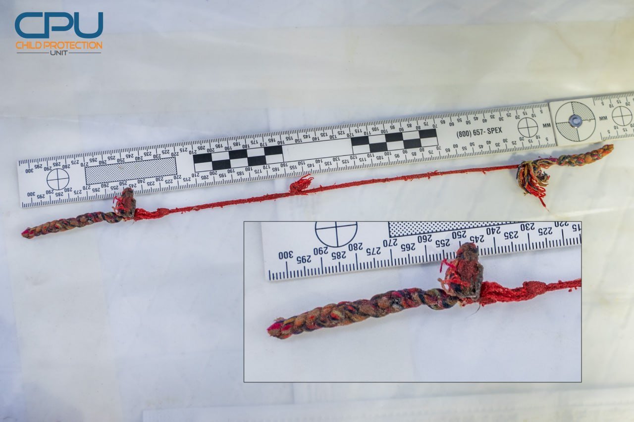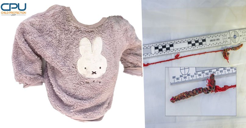 សាកសពរបស់កុមារនោះមានពាក់អាវរងារពណ៌ផ្កាឈូក/ស្វាយ (ដូចបង្ហាញក្នុងរូបខាងក្រោម) និងមានខ្សែកអង្កាំកប្បាសពណ៌ក្រហម និងស (ដូចបង្ហាញក្នុងរូបខាងក្រោម)។