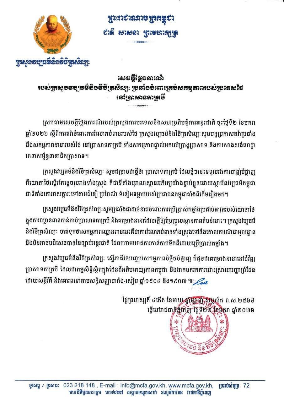 សេចក្តីថ្លែងការណ៍របស់ក្រសួងវប្បធម៌ និងវិចិត្រសិល្បៈ ប្រឆាំងចំពោះគ្រប់សកម្មភាពរបស់ប្រទេសថៃនៅប្រាសាទតាក្របី