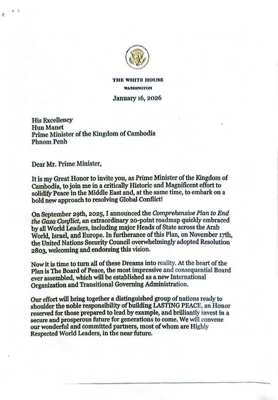 សារលិខិតរបស់ឯកឧត្តម ដូណាល់ ជេ ត្រាំ ប្រធានាធិបតីសហរដ្ឋអាមេរិក ជូនចំពោះសម្តេចមហាបវរធិបតី ហ៊ុន ម៉ាណែត នាយករដ្ឋមន្រ្តីនៃព្រះរាជាណាចក្រកម្ពុជា ដេីម្បីអញ្ជើញកម្ពុជាចូលរួមជារដ្ឋសមាជិកស្ថាបនិកនៃក្រុមប្រឹក្សាសន្តិភាព និងជាភាគីនៃធម្មនុញ្ញរបស់ក្រុមប្រឹក្សាសន្តិភាព។