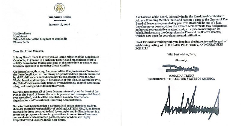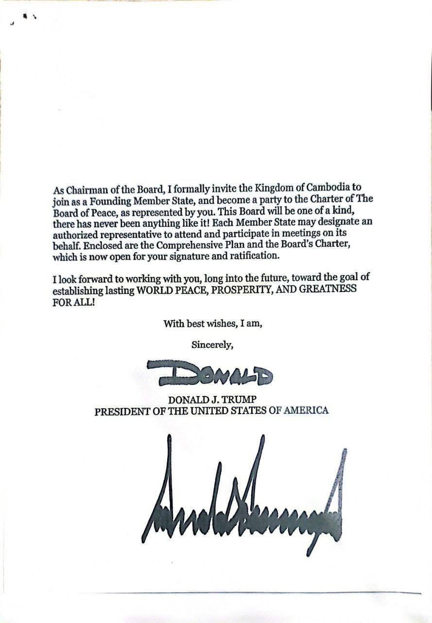 Invitation letter from the Honorable Donald J. Trump, President of the United States of America, to Samdech Moha Borvor Thipadei HUN Manet, Prime Minister of the Kingdom of Cambodia, to join as a Founding Member State and become a party to the Charter of the Board of Peace.