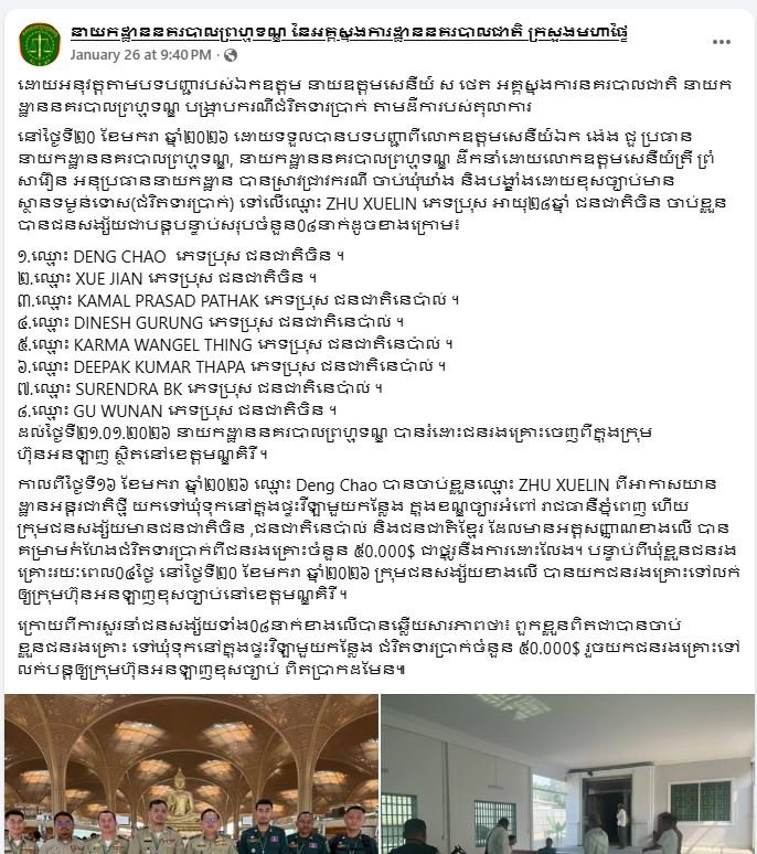 នៅថ្ងៃទី២០ ខែមករា ឆ្នាំ២០២៦ ដោយទទួលបានបទបញ្ជាពីលោកឧត្តមសេនីយ៍ឯក ង៉េង ជួ ប្រធាននាយកដ្ឋាននគរបាលព្រហ្មទណ្ឌ, នាយកដ្ឋាននគរបាលព្រហ្មទណ្ឌ ដឹកនាំដោយលោកឧត្តមសេនីយ៍ត្រី ព្រំ សារឿន អនុប្រធាននាយកដ្ឋាន បានស្រាវជ្រាវករណី ចាប់ឃុំឃាំង និងបង្ខាំងដោយខុសច្បាប់មានស្ថានទម្ងន់ទោស(ជំរិតទារប្រាក់) ទៅលើឈ្មោះ ZHU XUELIN (ហ្សូ ស៊ូលីន) ភេទប្រុស អាយុ២៨ឆ្នាំ ជនជាតិចិន ចាប់ខ្លួនបានជនសង្ស័យជាបន្តបន្ទាប់សរុបចំនួន០៨នាក់ដូចខាងក្រោម៖