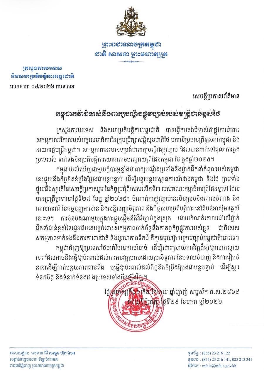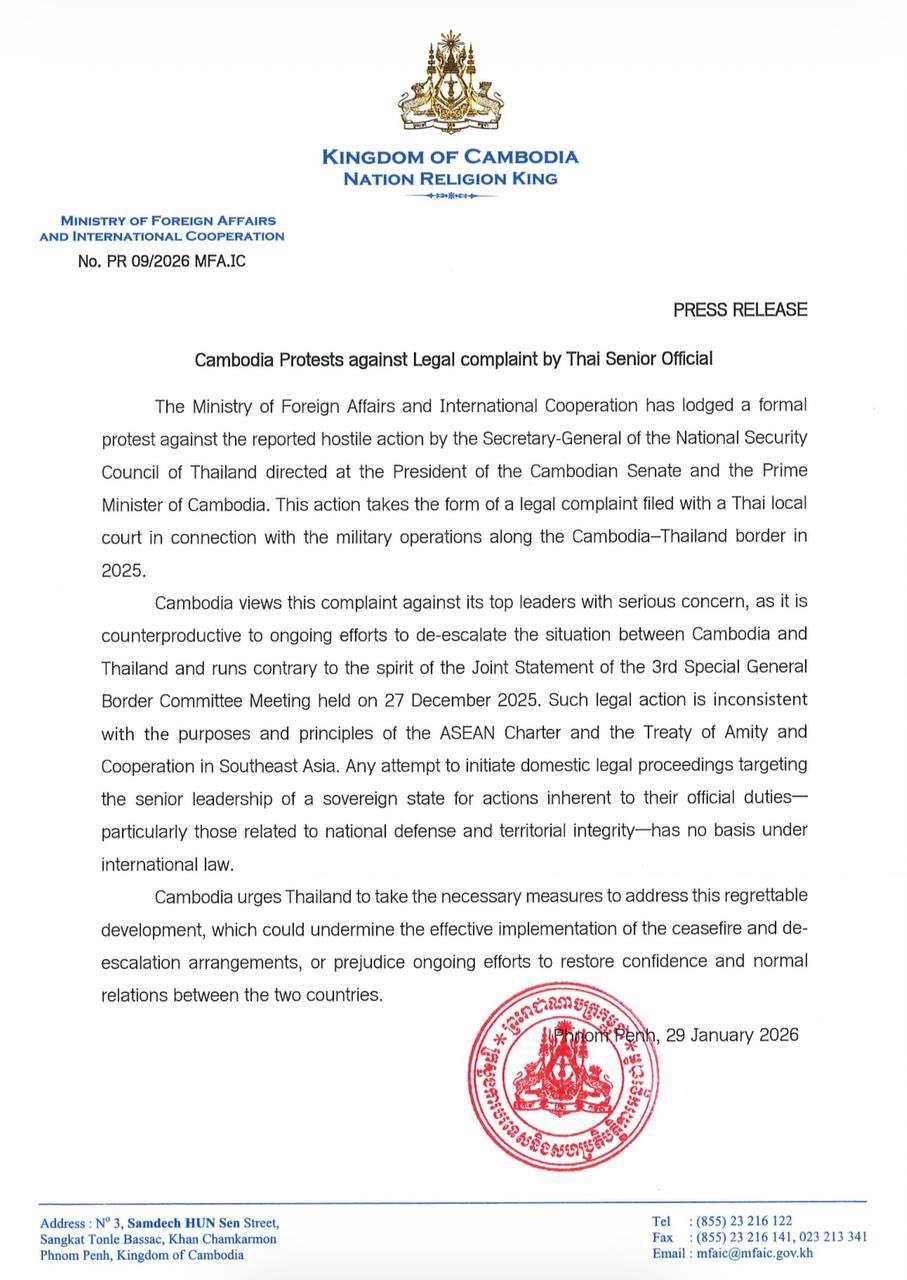 កម្ពុជា តវ៉ាជំទាស់នឹងពាក្យបណ្តឹងផ្លូវច្បាប់របស់មន្ត្រីជាន់ខ្ពស់ថៃ ព័ត៌មានជាតិ ដោយ TVFB ចេញផ្សាយ ថ្ងៃទី 29 ខែ មករា ឆ្នាំ 2026 ចែករំលែក