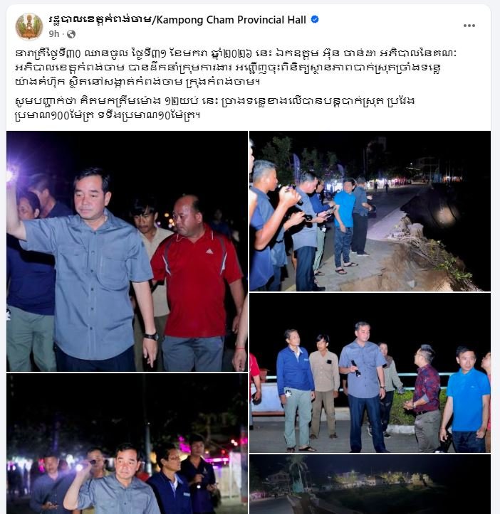 យោងតាមផេកផ្លូវការបស់ រដ្ឋបាលខេត្តកំពង់ចាម បានឲ្យដឹងថា នារាត្រីថ្ងៃទី៣០ ឈានចូល ថ្ងៃទី៣១ ខែមករា ឆ្នាំ២០២៦ នេះ ឯកឧត្តម អ៊ុន ចាន់ដា អភិបាលនៃគណៈអភិបាលខេត្តកំពង់ចាម បានដឹកនាំក្រុមការងារ អញ្ជើញចុះពិនិត្យស្ថានភាពបាក់ស្រុតច្រាំងទន្លេយ៉ាងគំហ៊ុក ស្ថិតនៅសង្កាត់កំពង់ចាម ក្រុងកំពង់ចាម។