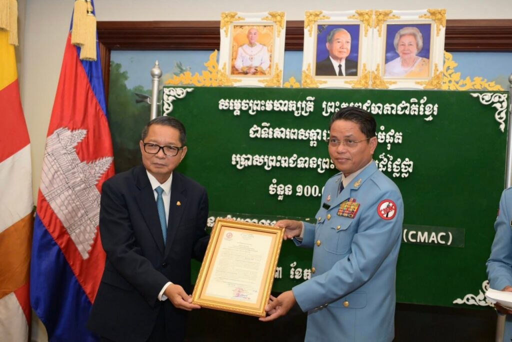ភ្នំពេញ ៖ មជ្ឈមណ្ឌលសកម្មភាពកម្ចាត់មីនកម្ពុជា (ស៊ីម៉ាក់) ទទួលបានការ សព្វព្រះរាជហឫទ័យពី សម្តេចព្រះមហាក្សត្រី នរោត្តម មុនិនាថ សីហនុ ព្រះវររាជមាតាជាតិខ្មែរ ប្រោសព្រះរាជទានព្រះរាជទ្រព្យ១០ម៉ឺនដុល្លារ ដើម្បីប្រើប្រាស់ក្នុងសកម្មភាពបោសសម្អាតមីន។