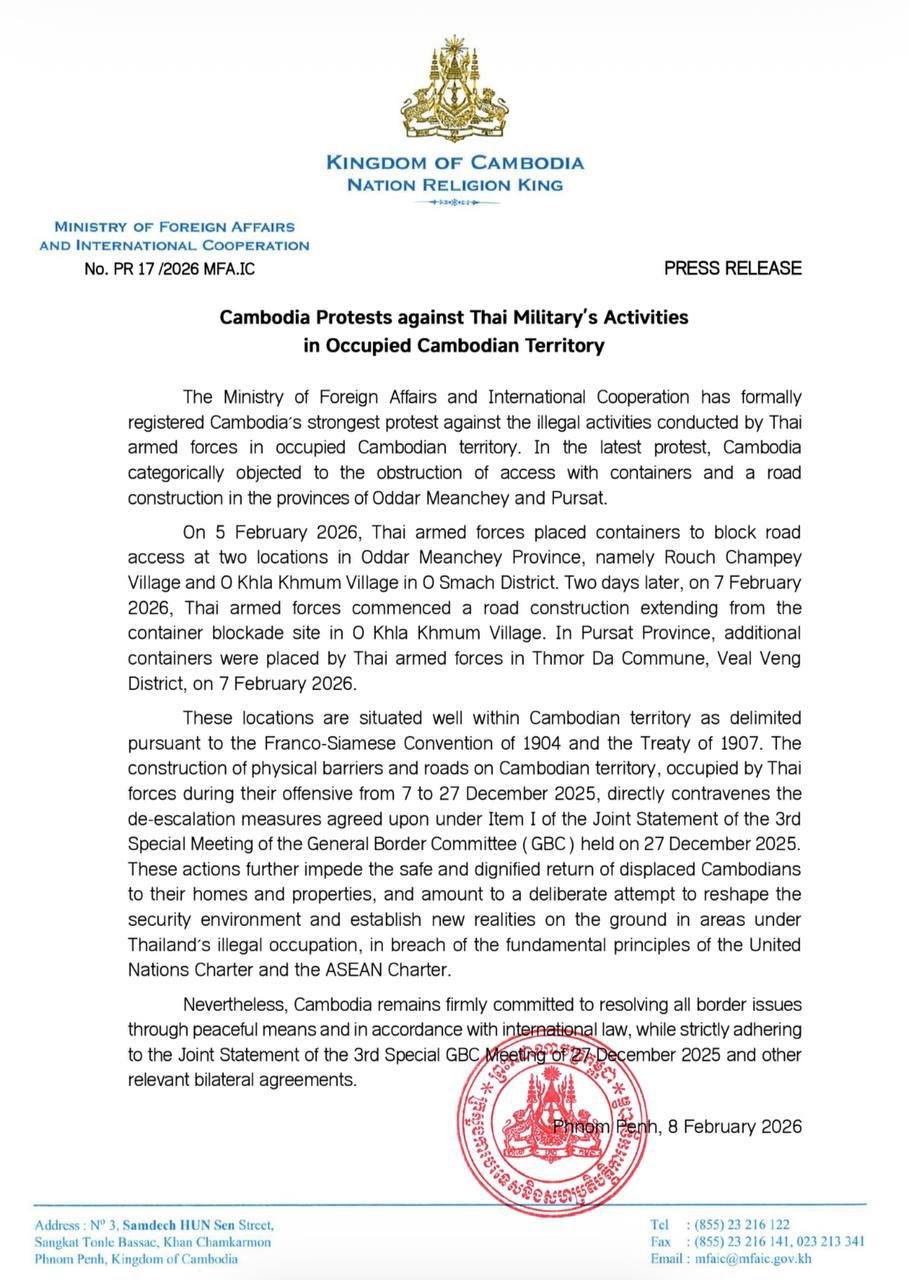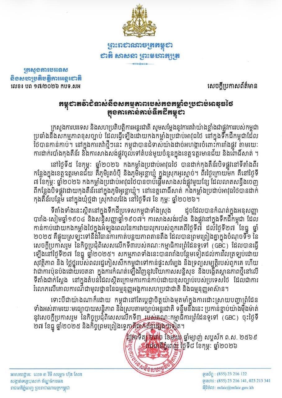 កម្ពុជាតវ៉ាជំទាស់នឹងសកម្មភាពរបស់កងកម្លាំងប្រដាប់អាវុធថៃ ក្នុងការកាន់កាប់ទឹកដីកម្ពុជា ព័ត៌មានជាតិ ដោយ TVFB ចេញផ្សាយ ថ្ងៃទី 9 ខែ កុម្ភះ ឆ្នាំ 2026 ចែករំលែក