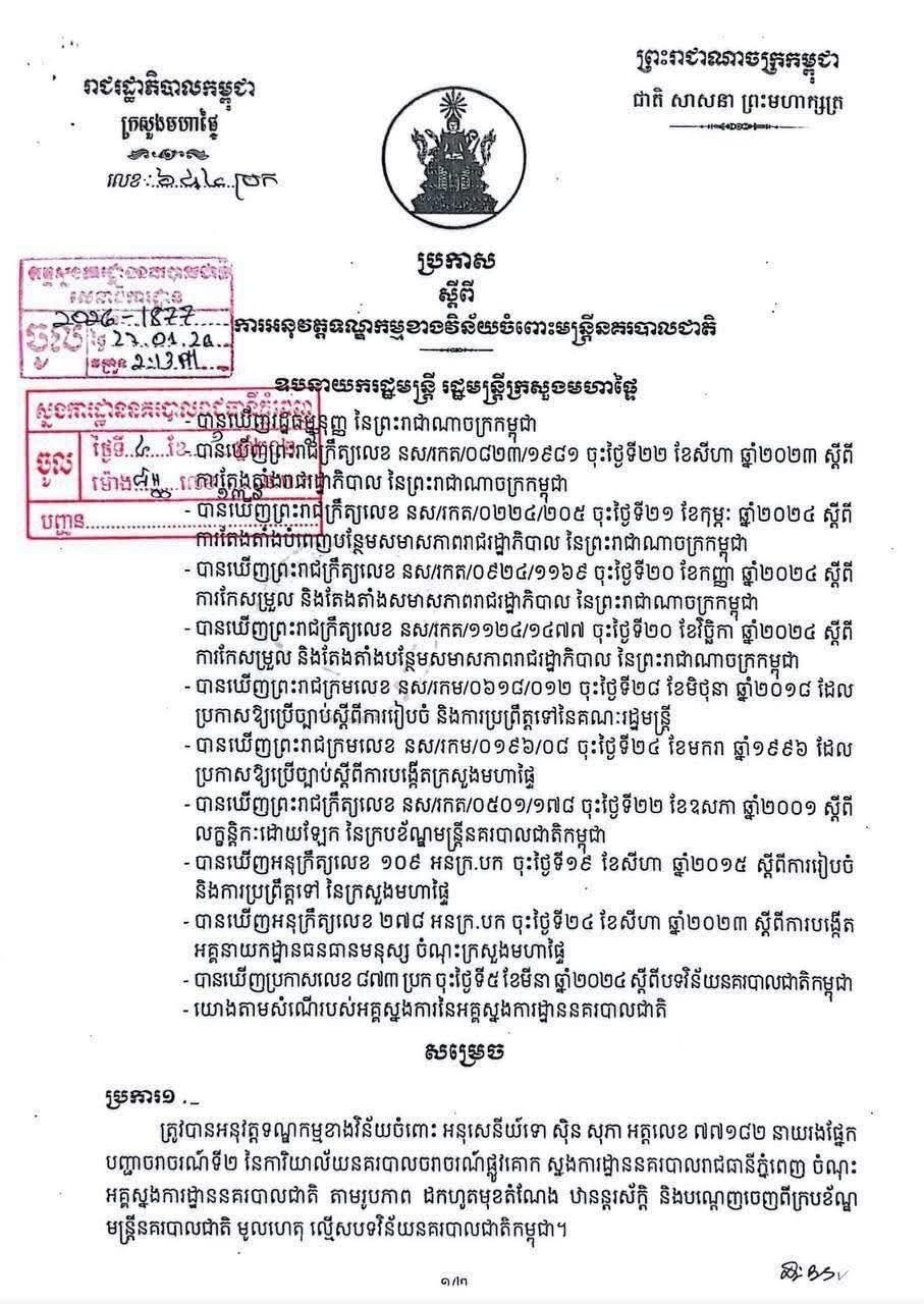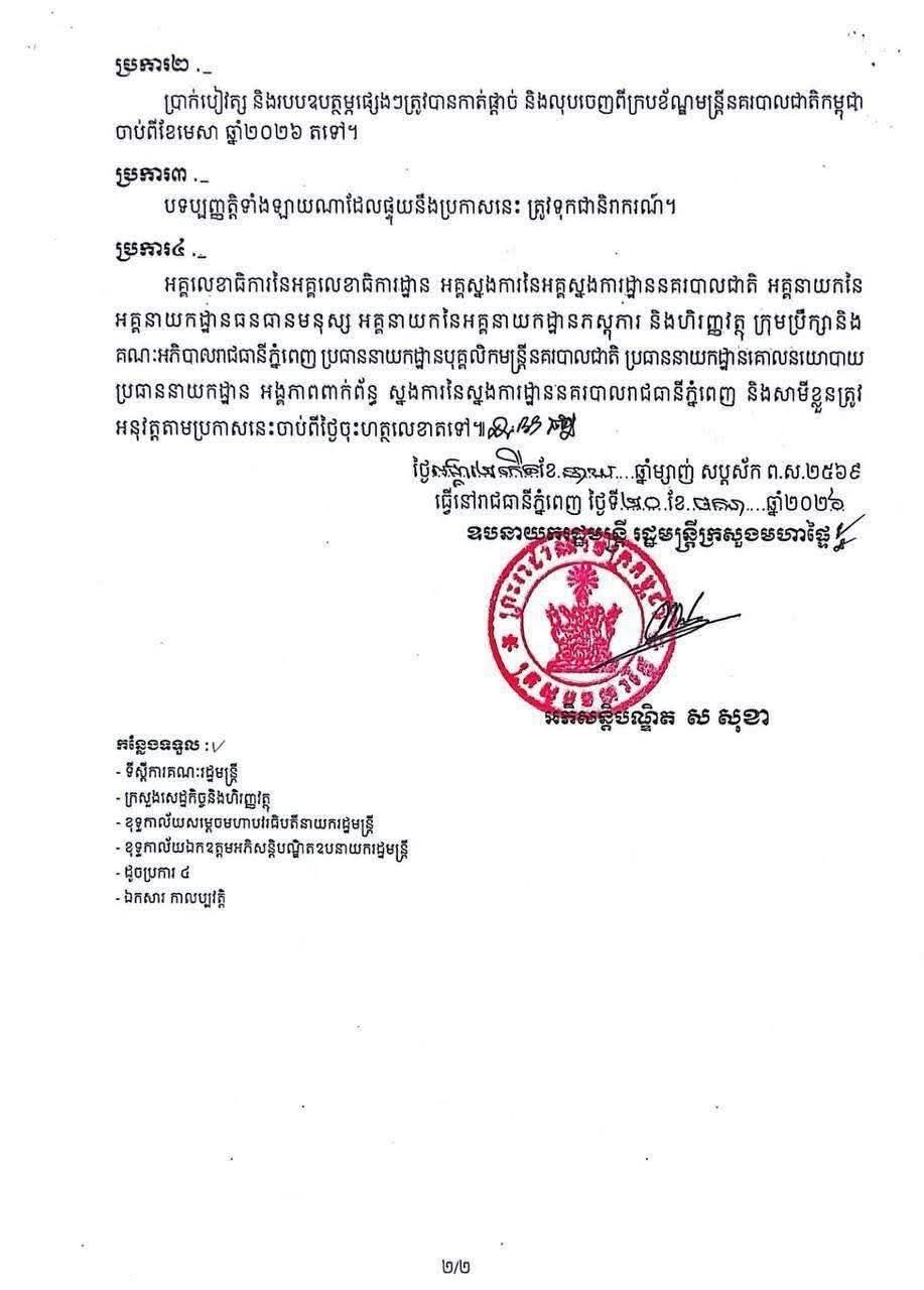 នាយរងផ្នែកបញ្ជាចរាចរណ៍ទី២ នៃស្នងការដ្ឋាននគរបាលរាជធានីភ្នំពេញ ត្រូវបានរដ្ឋមន្រ្តីក្រសួងមហាផ្ទៃ ដកហូតតំណែង ឋារនន្តស័ក្តិ និងបណ្តេញចេញពីក្របខ័ណ្ឌនគរបាលជាតិ ដោយសារល្មើសបទវិន័យនគរបាលជាតិ។ ព័ត៌មានជាតិ ដោយ TVFB ចេញផ្សាយ ថ្ងៃទី 13 ខែ កុម្ភះ ឆ្នាំ 2026 ចែករំលែក