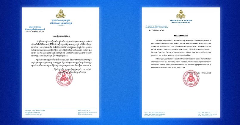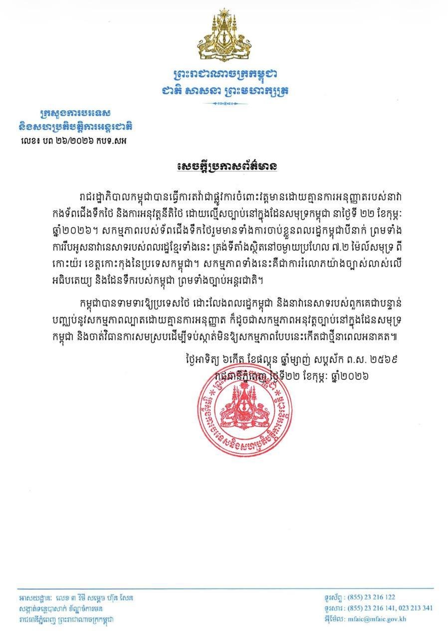 កម្ពុជា ទាមទារឲ្យទ័ពជើងទឹកថៃ ដោះលែងពលរដ្ឋកម្ពុជា ០៣នាក់ ដែលទ័ពជើងទឹកថៃបានចាប់ ព្រមទាំងរឹបអូសនាវានេសាទ ពីកោះយ៉រ ខេត្តកោះកុង នៃប្រទេសកម្ពុជា