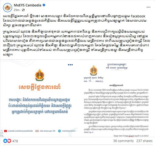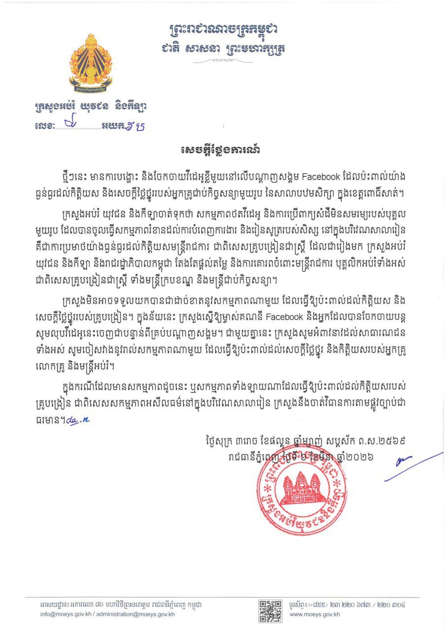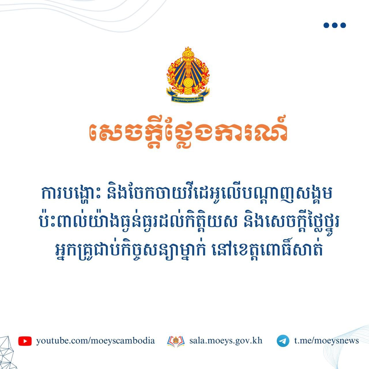 សេចក្ដីថ្លែងការណ៍ ថ្មីៗនេះ មានការបង្ហោះ និងចែកចាយវីដេអូខ្លីមួយនៅលើបណ្តាញសង្គម Facebook ដែលប៉ះពាល់យ៉ាងធ្ងន់ធ្ងរដល់កិត្តិយស និងសេចក្តីថ្លៃថ្នូររបស់អ្នកគ្រូជាប់កិច្ចសន្យាម្នាក់ នៃសាលាបឋមសិក្សា ក្នុងខេត្តពោធិ៍សាត់។