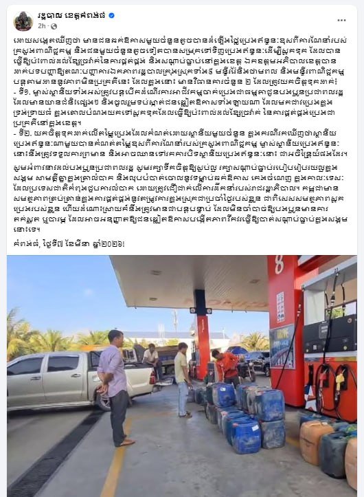កំពង់ធំ÷យោងតាមគណនី facebook page ផ្លូវការរបស់ឯកឧត្តមនួន ផារ័ត្ន អភិបាលខេត្តកំពង់ធំ ថ្ងៃទី៧ ខែមីនា ឆ្នាំ២០២៦ ដែលបានចុះផ្សាយថា÷ដោយសង្កេតឃើញថា មានជនឆក់ឱកាសមួយក្តាប់តូចបានដំឡើងថ្លៃប្រេងឥន្ទនៈខុសពីការណែនាំរបស់ក្រសួងពាណិជ្ជកម្ម និងជនមួយចំនួនទៀតបានសម្រុកទៅទិញប្រេងឥន្ទនៈដើម្បីស្តុកទុក ដែលបានធ្វើឱ្យប៉ះពាល់ដល់ខ្សែច្រវ៉ាក់នៃការផ្គត់ផ្គង់ និងសណ្តាប់ធ្នាប់ល្អនៅក្នុងភូមិសាស្រ្តខេត្ត ខ្ញុំបានណែនាំឱ្យគណៈបញ្ជាការឯកភាពរដ្ឋបាលក្រុងស្រុកទាំង៩ មន្ទីររ៉ែនិងថាមពល និងមន្ទីរពាណិជ្ជកម្ម បន្តតាមដាននូវភាពមិនប្រក្រតីនេះ ដែលក្នុងនោះ មានវិធានការចំនួន ២ ដែលត្រូវយកចិត្តទុកដាក់៖