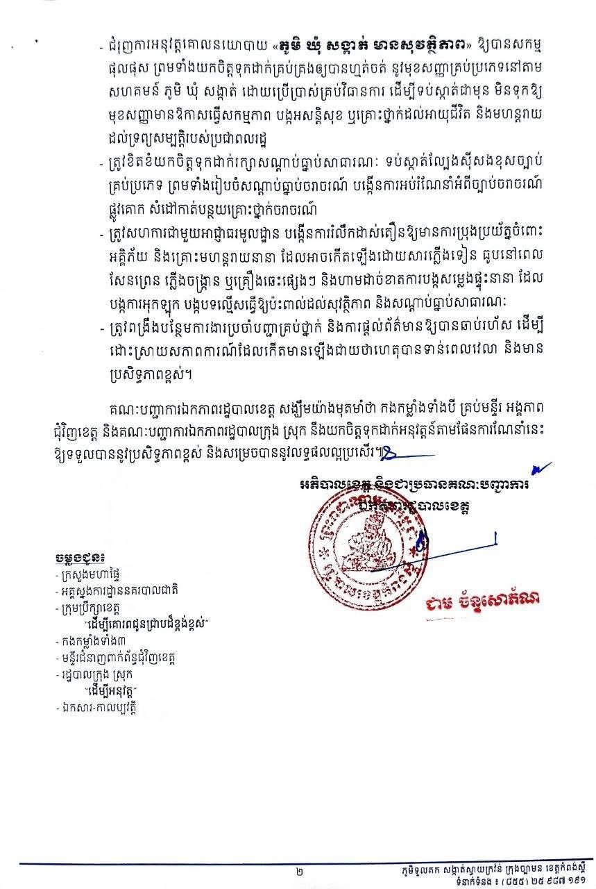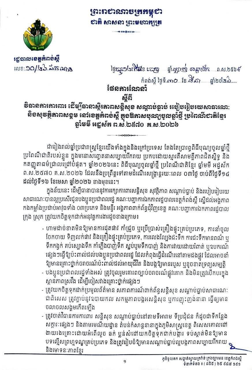 ខេត្តកំពង់ស្ពឺ ចូលឆ្នាំឆ្នាំនេះក៏ដូចរាជធានីភ្នំពេញដែរ ហាមលេងគប់ស្បោងទឹក បាញ់ទឹក ជះទឹក លើដងផ្លូវសាធារណៈ និងសូមបំផុសការលេងល្បែងប្រជាប្រិយខ្មែរឲ្យបានច្រើន !