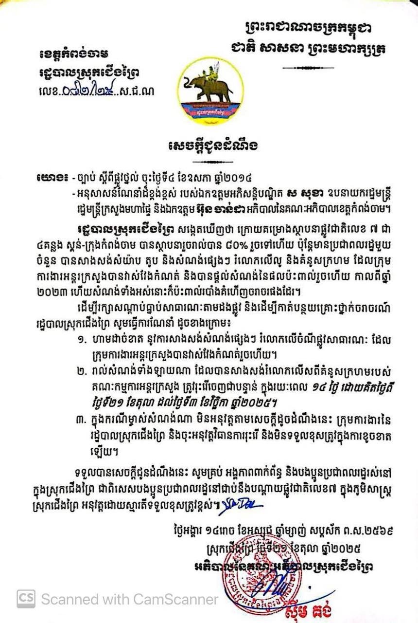 រដ្ឋបាលស្រុកជើងព្រៃ ទុកពេល១៤ថ្ងៃ អោយរុះរើចេញ ចំពោះម្ចាស់សំណង់ដែលសង់រំលោភលើលូ និងគំនូសក្រហមដែលបានកំណត់ លើផ្លូវជាតិលេខ៧ ស្គន់-កំពង់ចាម