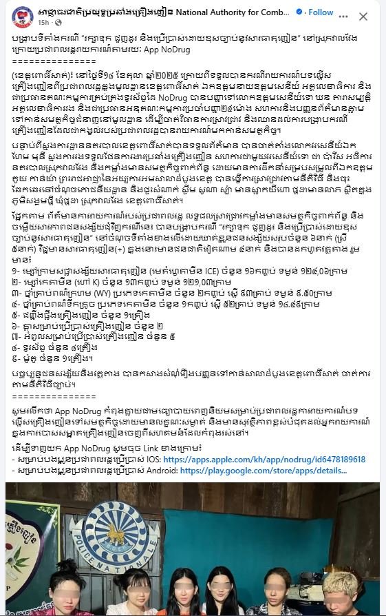 (ខេត្តពោធិ៍សាត់)៖ យោងតាមផេកផ្លូវការរបស់ អាជ្ញាធរជាតិប្រយុទ្ធប្រឆាំងគ្រឿងញៀន បានបង្ហោះនៅថ្ងៃទី២៣ ខែតុលា ឆ្នាំ២០២៥ ទាំងស្រុងថា អាជ្ញាធរជាតិប្រយុទ្ធប្រឆាំងគ្រឿងញៀន កាលពីនៅថ្ងៃទី១៨ ខែតុលា ឆ្នាំ២០២៥ ក្រោយពីទទួលបានករណីរាយការណ៍បទល្មើសគ្រឿងញៀនពីប្រជាពលរដ្ឋក្នុងមូលដ្ឋានខេត្តពោធិ៍សាត់ ឯកឧត្តមនាយឧត្ដមសេនីយ៍ អគ្គលេខាធិការ និងជាប្រធានគណៈកម្មការគ្រប់គ្រងទូរស័ព្ទដៃ NoDrug បានបញ្ជាទៅលោកឧត្ដមសេនីយ៍ទោ ឃន តារាសម្បត្តិ អគ្គលេខាធិការរង និងជាប្រធានអនុគណៈកម្មការប្រចាំបញ្ជា២៤ម៉ោង សហការនិងបញ្ជូនព័ត៌មានភ្លាមទៅកាន់សមត្ថកិច្ចជំនាញនៅមូលដ្ឋាន ដើម្បីចាត់វិធានការស្រាវជ្រាវ និងឈានដល់ការបង្ក្រាបករណីគ្រឿងញៀនដែលជាកង្វល់របស់ប្រជាពលរដ្ឋបានរាយការណ៍មកកាន់សមត្ថកិច្ច។