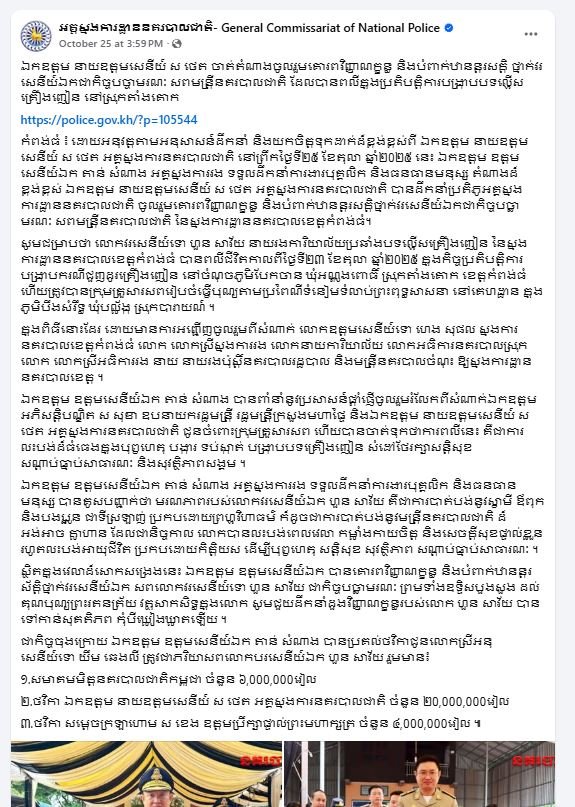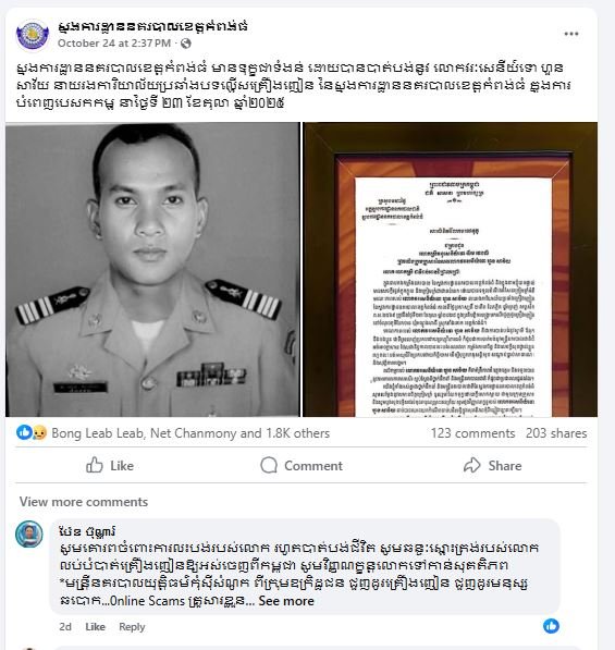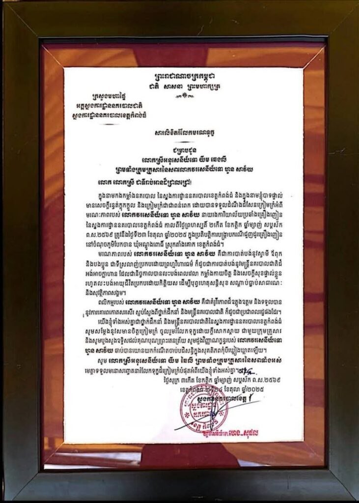 ខេត្តកំពង់ធំ: សូមចូលរួមរំលែកទុក្ខផង មន្ត្រីនគរបាលម្នាក់បានបាត់បង់ជីវិត និងម្នាក់ទៀតរបួសធ្ងន់ បន្ទាប់ពីត្រូវជនសង្ស័យជួញដូរថ្នាំញៀន ប្រើកាំភ្លើងបាញ់រះមកលើសមត្ថកិច្ច កាលពីវេលាម៉ោង១៥:១០នាទី ថ្ងៃទី២៣ ខែតុលា ឆ្នាំ២០២៥ ស្ថិតនៅចំណុចភូមិ បែកចាន ឃុំអណ្តូងពោធិ៍ ស្រុកតាំងគោក ខេត្តកំពង់ធំ ក្នុងប្រតិបត្តិការបង្ក្រាបគ្រឿងញៀន ។