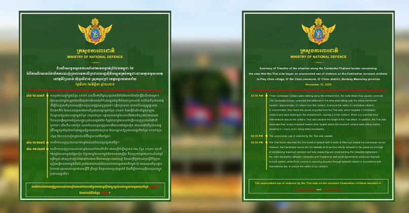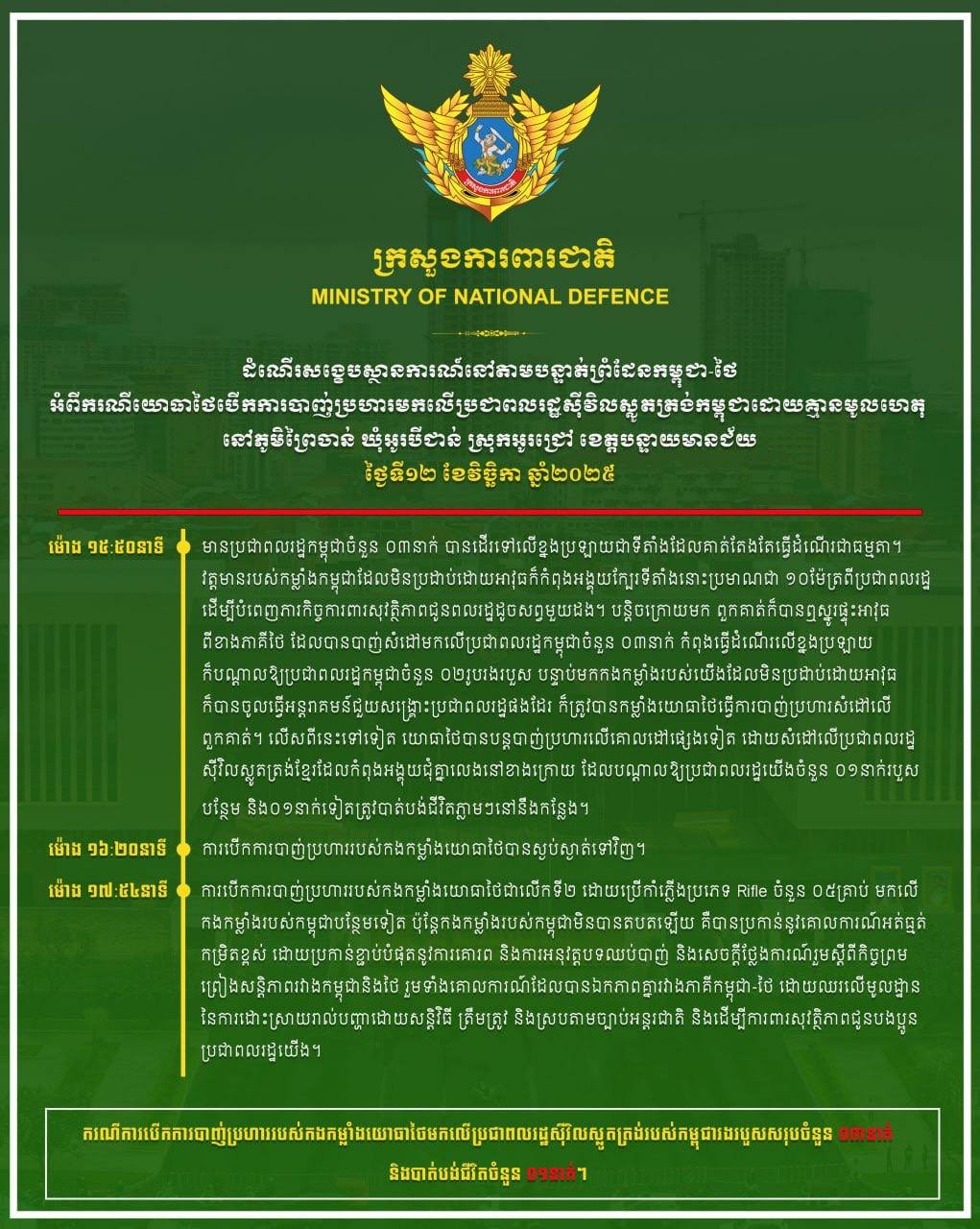 ក្រសួងការពារជាតិ ៖ ពលរដ្ឋកម្ពុជាកំពុងដើរលើខ្នងប្រឡាយ ស្រាប់តែទាហានសៀមបាញ់ប្រហារពួកគាត់របួស០២នាក់ រួចបាញ់សម្តៅទាំងទាហានកម្ពុជាដែលចូលទៅជួយទៀត បន្ទាប់ទាហានសៀមបន្តបាញ់សម្តៅលើជនស៊ីវិលកម្ពុជាកំពុងអង្គុយលេងក្នុងតង់ របួសម្នាក់ និងស្លាប់ម្នាក់បន្ថែម!!!