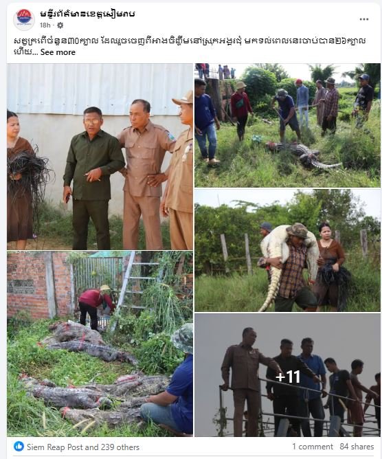 ខេត្តសៀមរាប ៖ យោងតាមផេកផ្លូវការរបស់ មន្ទីរព័ត៌មានខេត្តសៀមរាប បានឲ្យដឹងថា កាលយប់ថ្ងៃទី១១ ខែវិច្ឆិកា ឆ្នាំ២០២៥ មានករណីសត្វក្រពើរួចចេញពីអាងចិញ្ចឹមរបស់លោក ឈឿង សុីម៉ាក នៅភូមិតាលាវ ឃុំតាសោម ស្រុកអង្គរជុំ ខេត្តសៀមរាប ដែលនៅក្នុងទ្រុងមានក្រពើសរុបចំនួន ៧៣ក្បាល បានចេញពីអាងចំនួន ៣០ក្បាល។