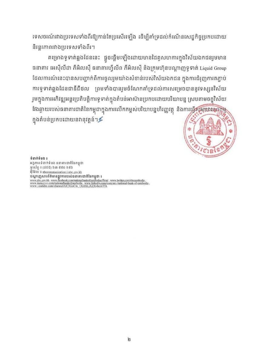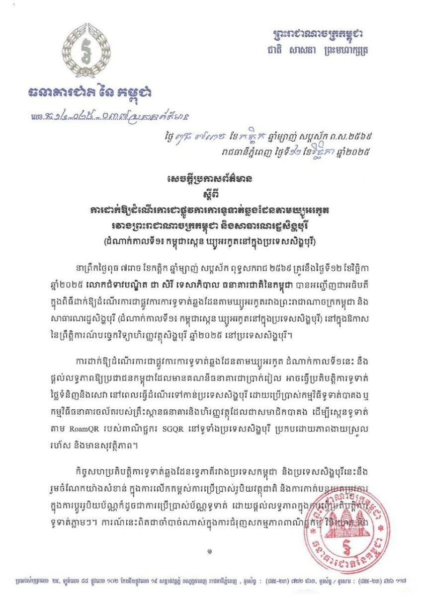 កម្ពុជា-សិង្ហបុរី ប្រកាសដាក់ឱ្យដំណើរការជាផ្លូវការ ការទូទាត់ឆ្លងដែនតាមឃូអរកូត ដំណាក់កាលទី១ ដើម្បីផ្តល់លទ្ធភាពឱ្យ ប្រជាជនកម្ពុជា ដែលមានគណនីធនាគារជាប្រាក់រៀល អាចធ្វើប្រតិបត្តិការទូទាត់ថ្លៃទំនិញ និងសេវា នៅពេលធ្វើដំណើរទៅកាន់ ប្រទេសសិង្ហបុរី