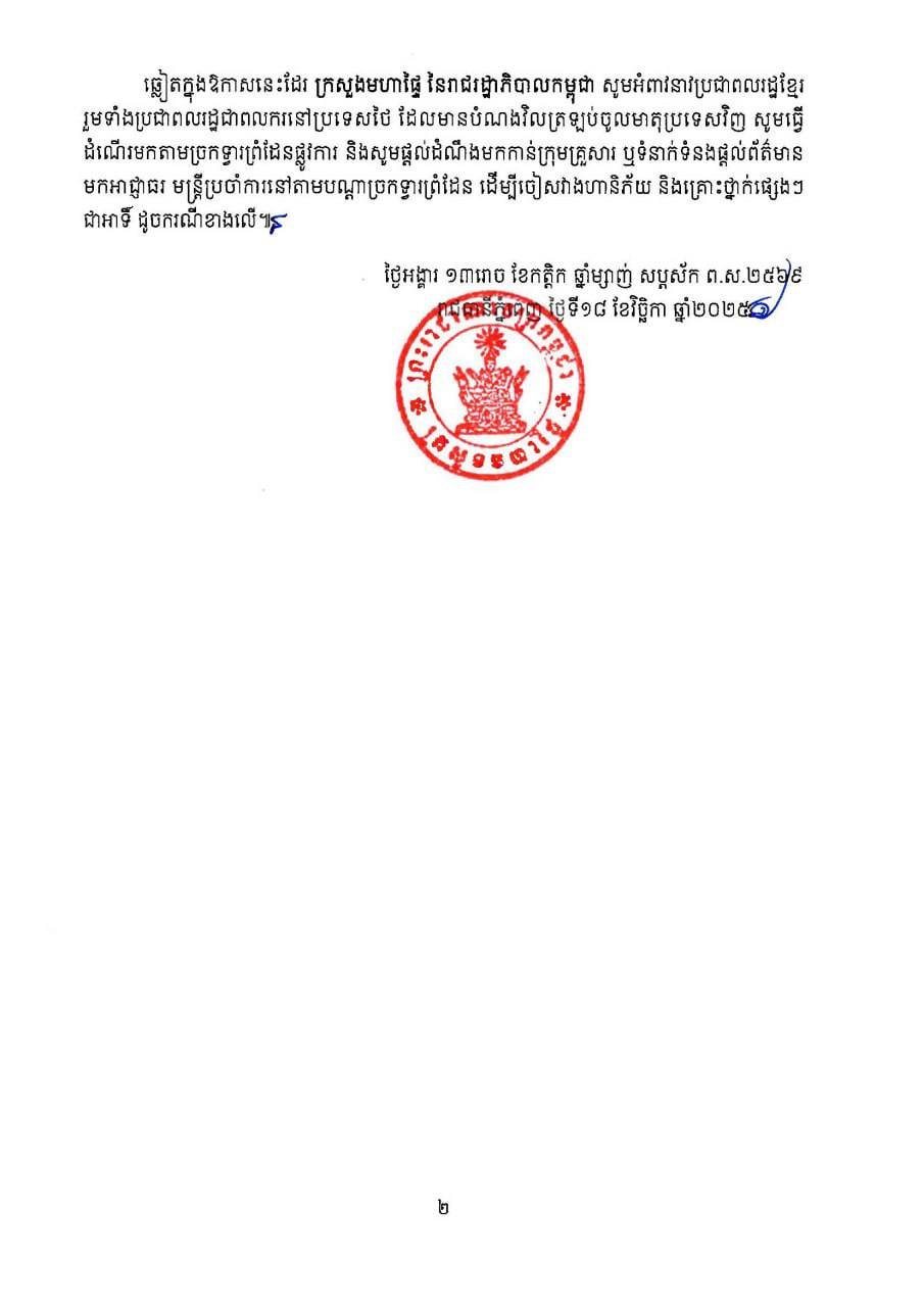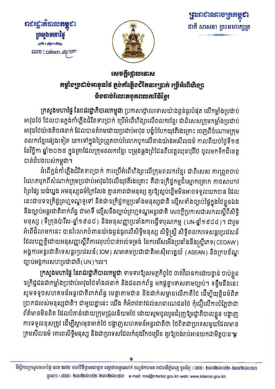 ក្រសួងមហាផ្ទៃ ចេញសេចក្តីថ្កោលទោសកម្លាំងប្រដាប់អាវុធថៃ ភ្លង់កាំភ្លើងជំរិតទារប្រាក់ ប្រើអំពើហិង្សា និងចាប់រំលោភបូកពលការិនីខ្មែរ